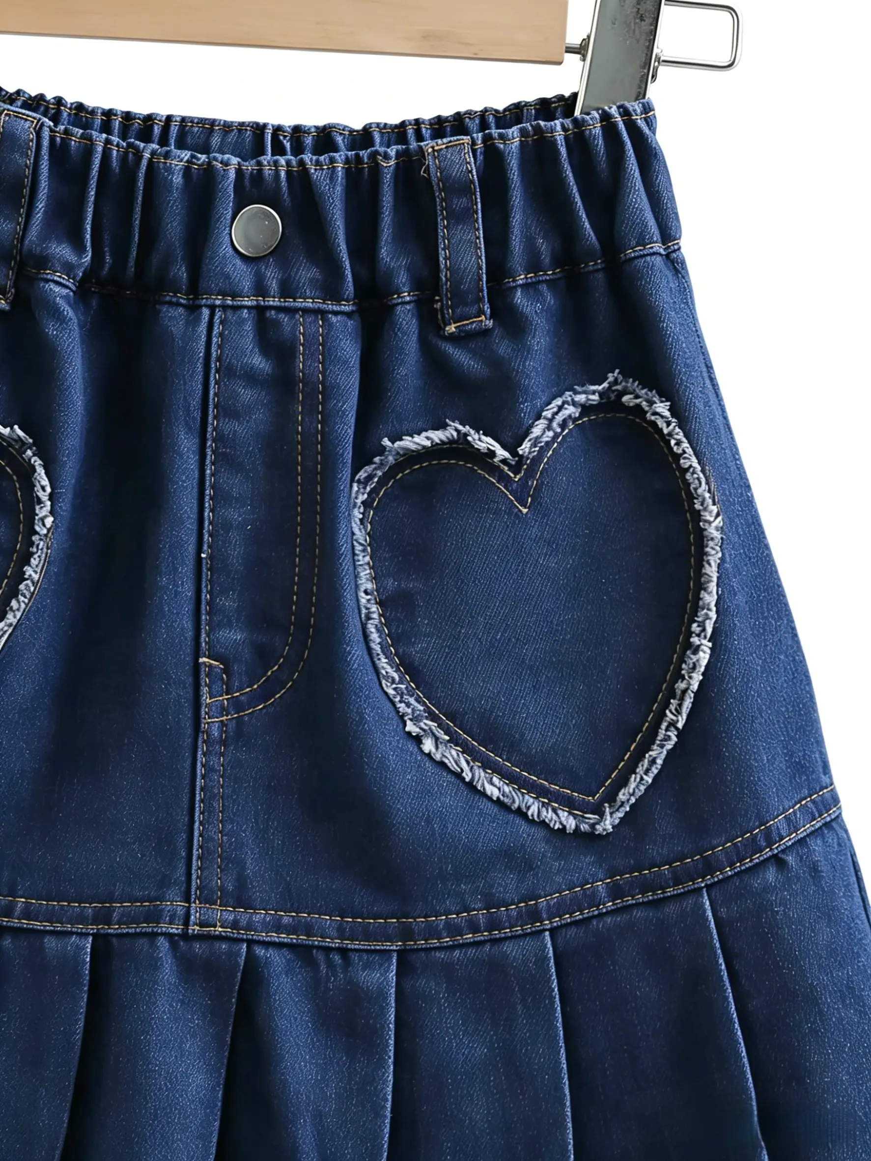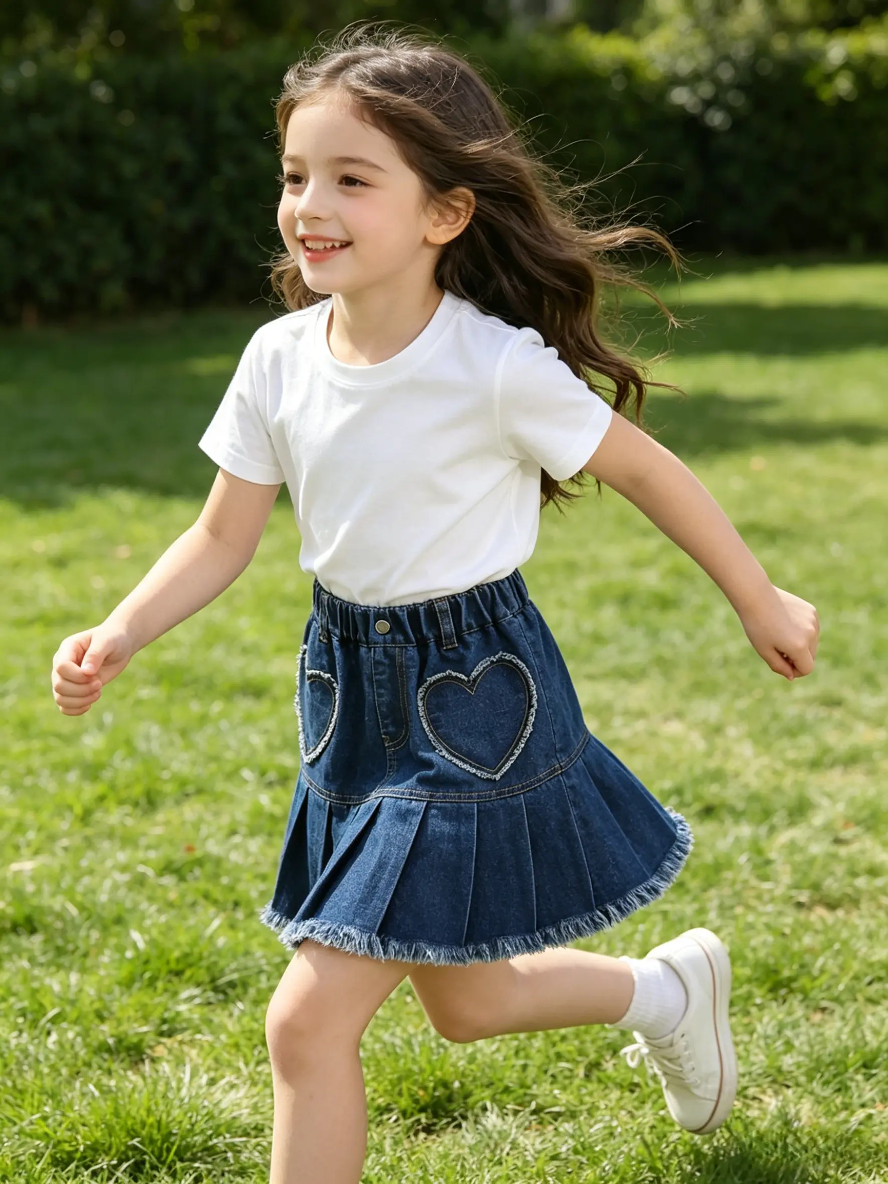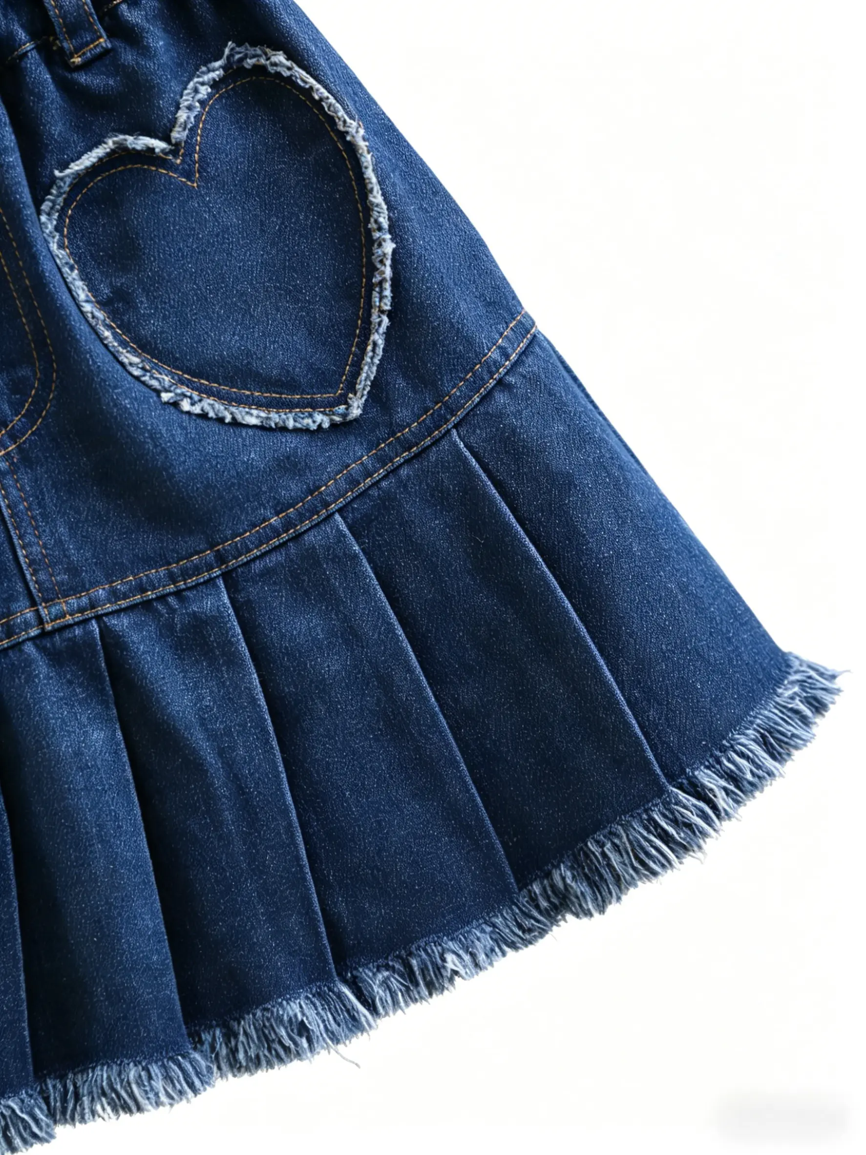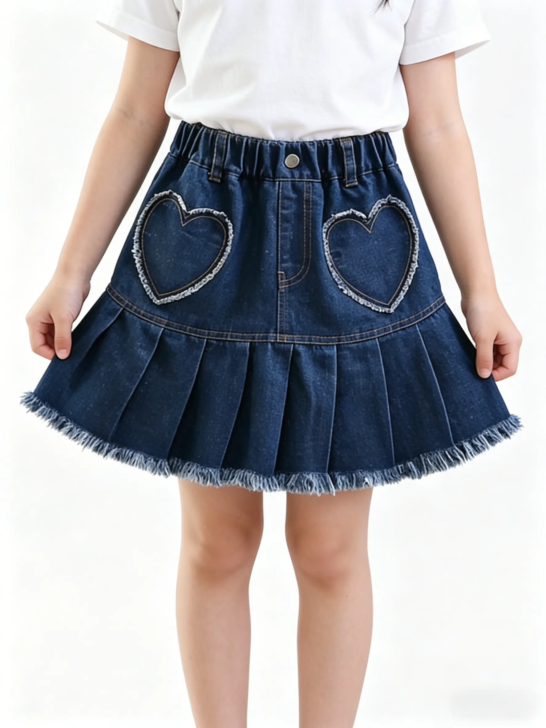 This girls’ denim skirt features classic denim fabric combined with a fashionable pleated design, retaining the durability of denim while adding softness and a touch of dynamism. Special heart pocket elements were added on the front side, making the overall design more playful and cute, which is loved by little girls.