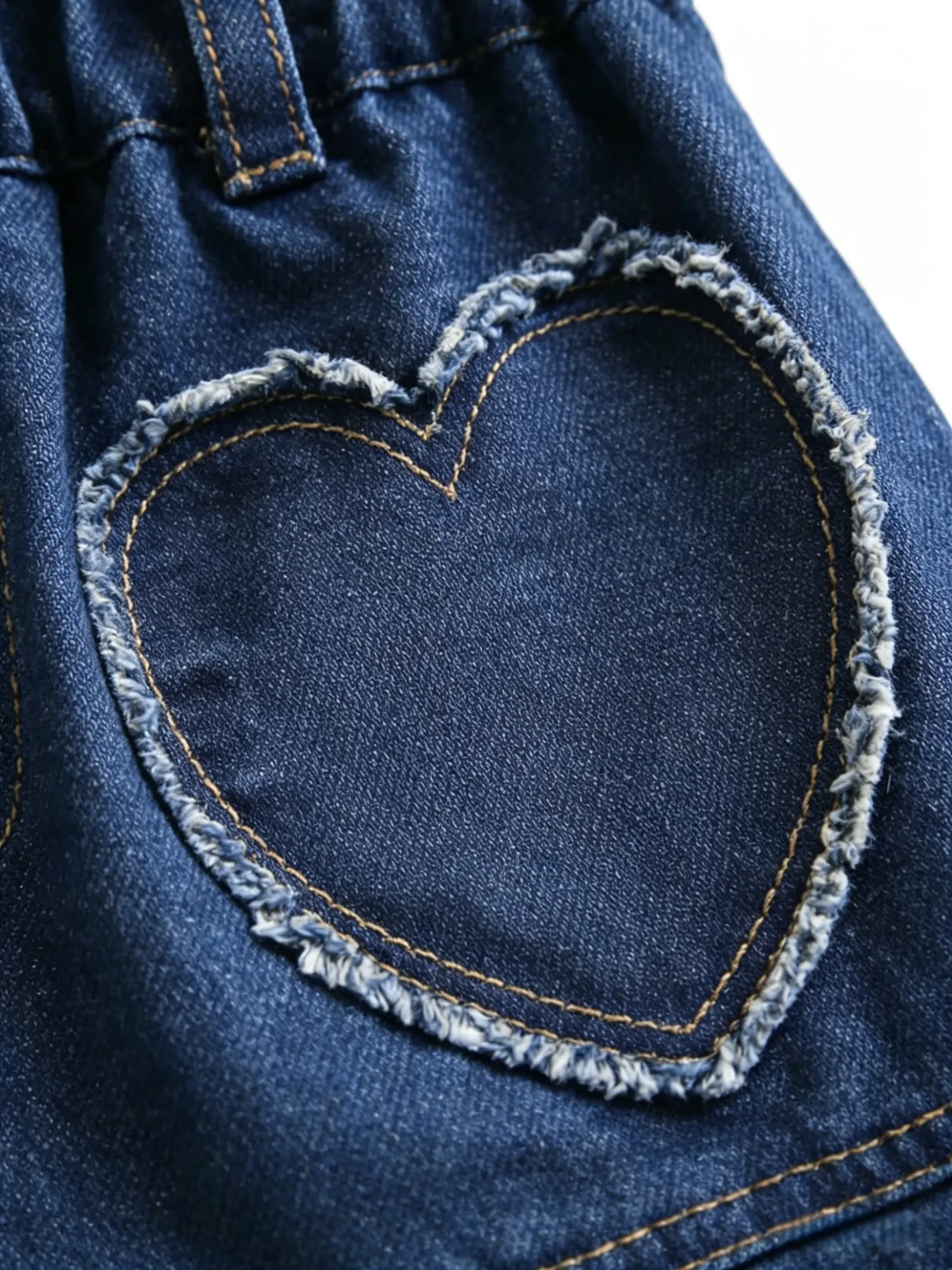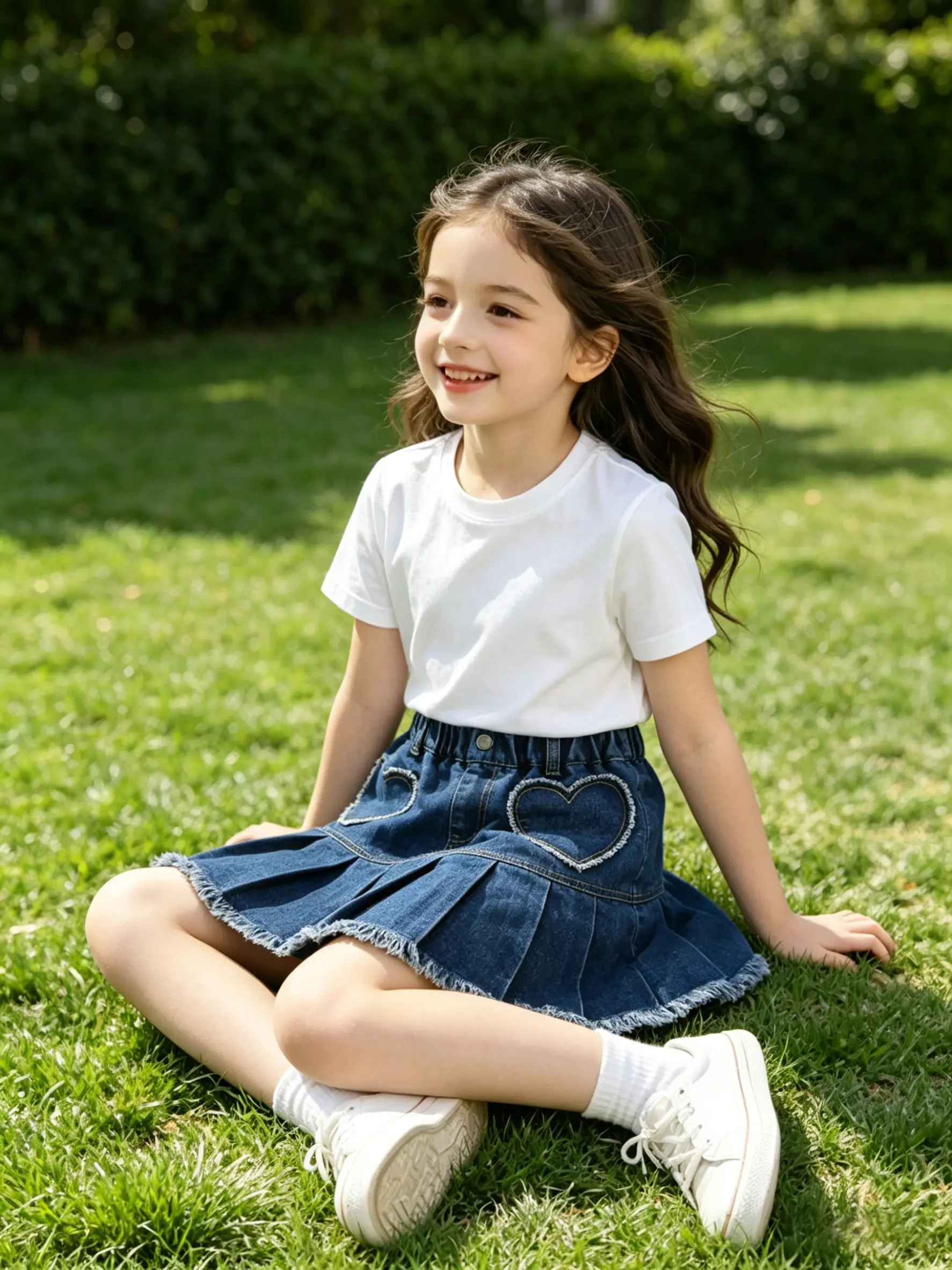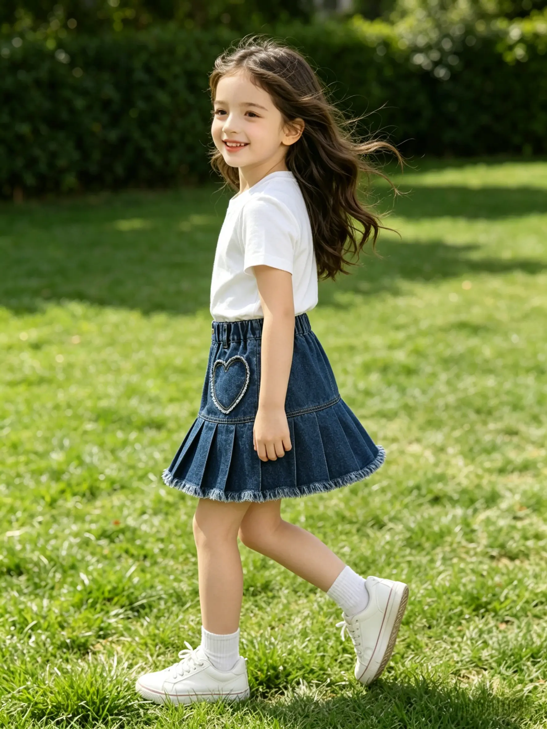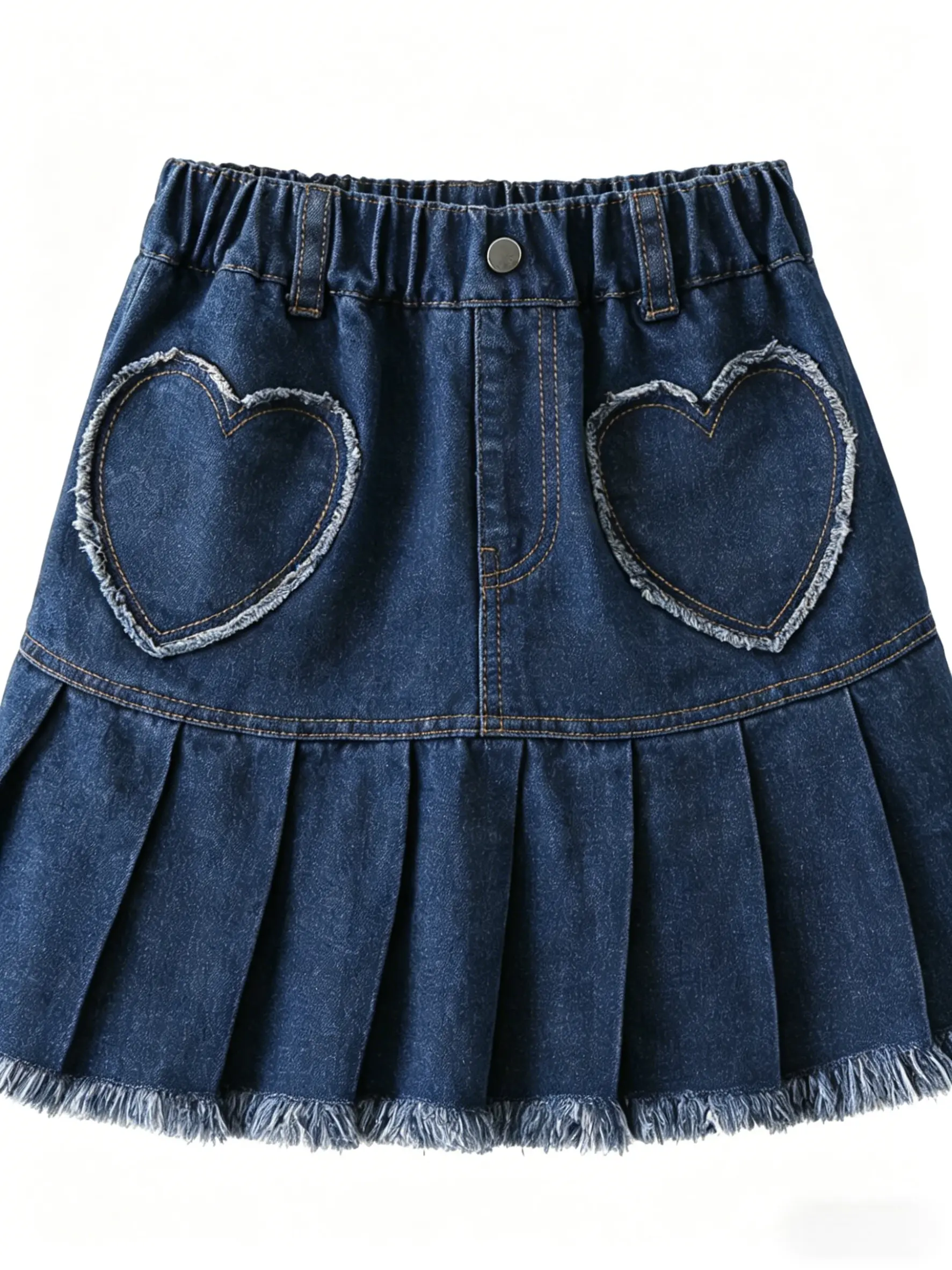 This girls’ denim skirt features classic denim fabric combined with a fashionable pleated design, retaining the durability of denim while adding softness and a touch of dynamism. Special heart pocket elements were added on the front side, making the overall design more playful and cute, which is loved by little girls.