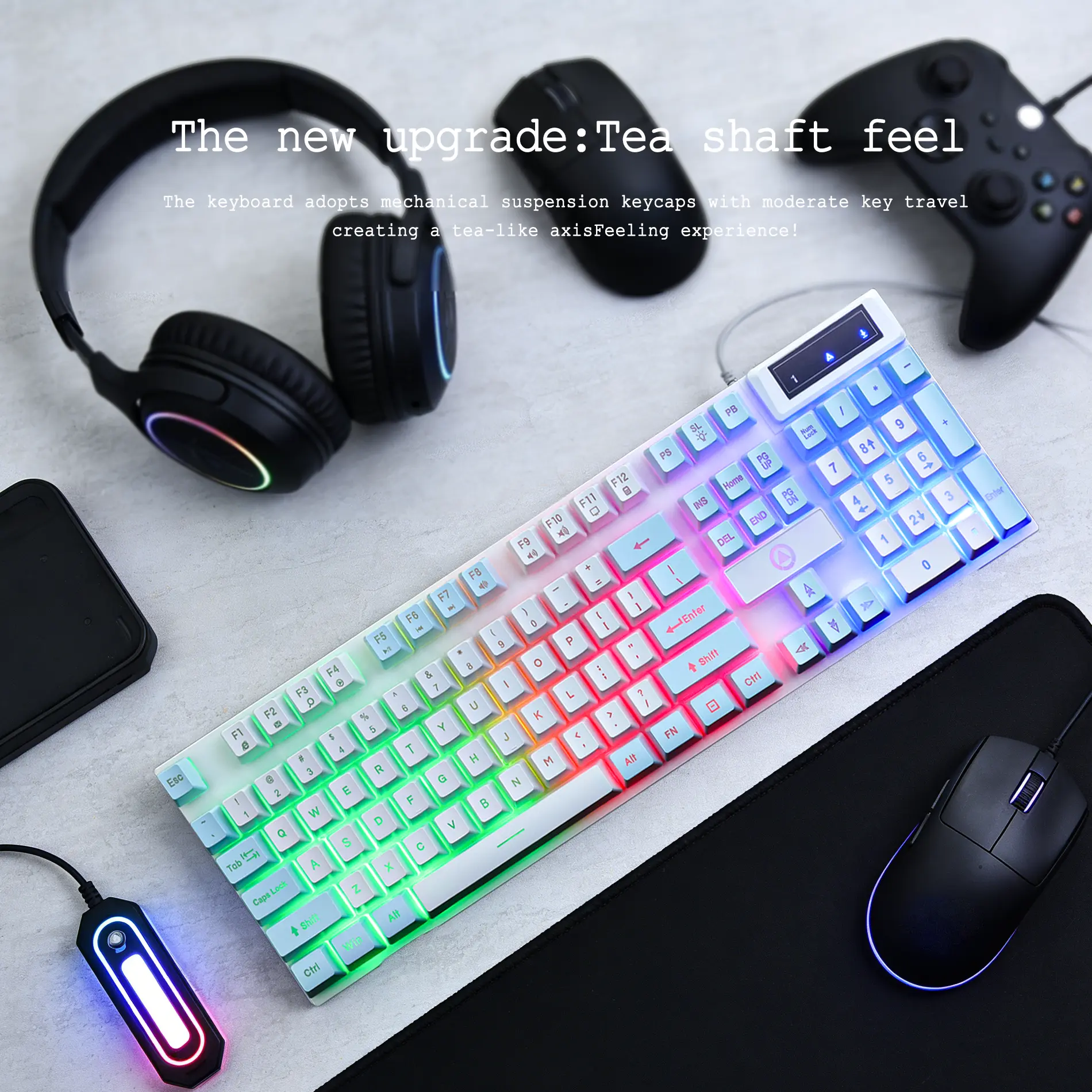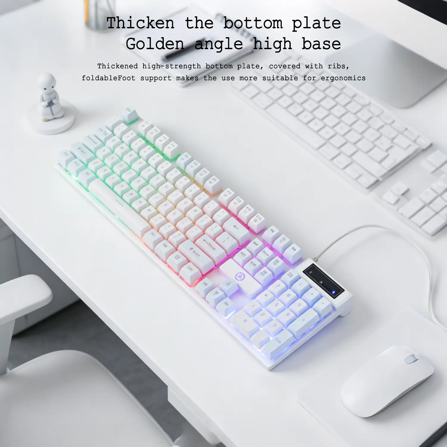 【Liquid Silicone & Dual Light Design】This gaming keyboard is made of liquid silicone material, equipped with gap & character dual luminous design. The backlight can be turned off freely, and characters remain clear even when the backlight is off. It adopts mixed-color rainbow lighting with natural light transition, bringing a cool visual effect.