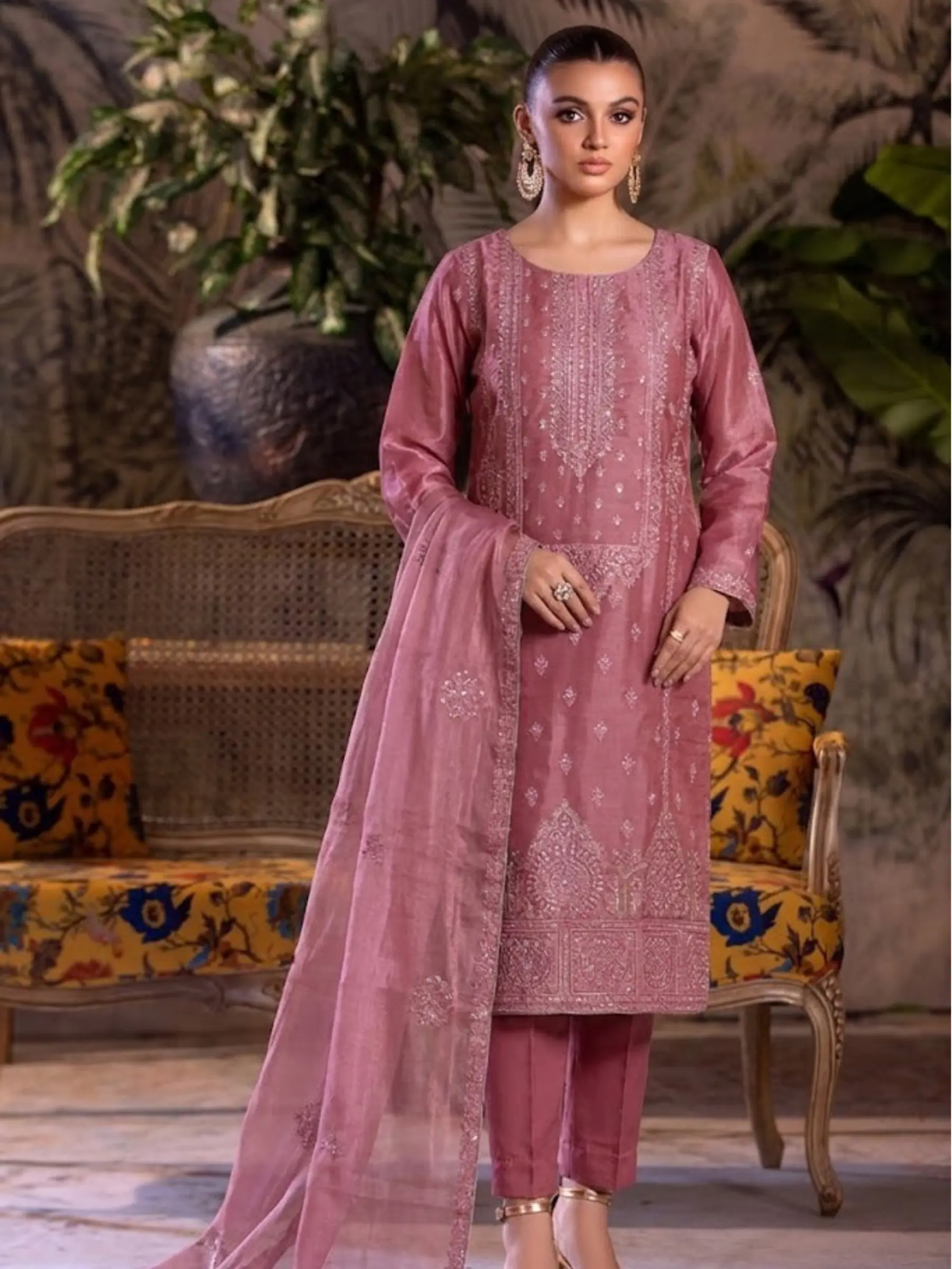Upgrade your wardrobe with this luxurious 3-piece embroidered suit, designed for elegance and comfort. The sheesha silk fabric shirt and trouser feature delicate embroidery that adds a refined traditional look, while the plain organza dupatta with subtle gold tone completes the outfit with graceful sophistication. Perfect for Eid, weddings, festive gatherings, dinners, and formal events, this outfit blends modern style with classic ethnic elegance. The lightweight fabric keeps you comfortable while looking effortlessly stylish. Includes: • Embroidered Shirt • Matching Trouser • Plain Chiffon Gold Dupatta Features: • Premium silky soft fabric • Elegant embroidery on shirt & trouser • Lightweight chiffon dupatta • Comfortable & breathable • Perfect for festive and formal wear Style it with heels and statement earrings for a complete elegant look.