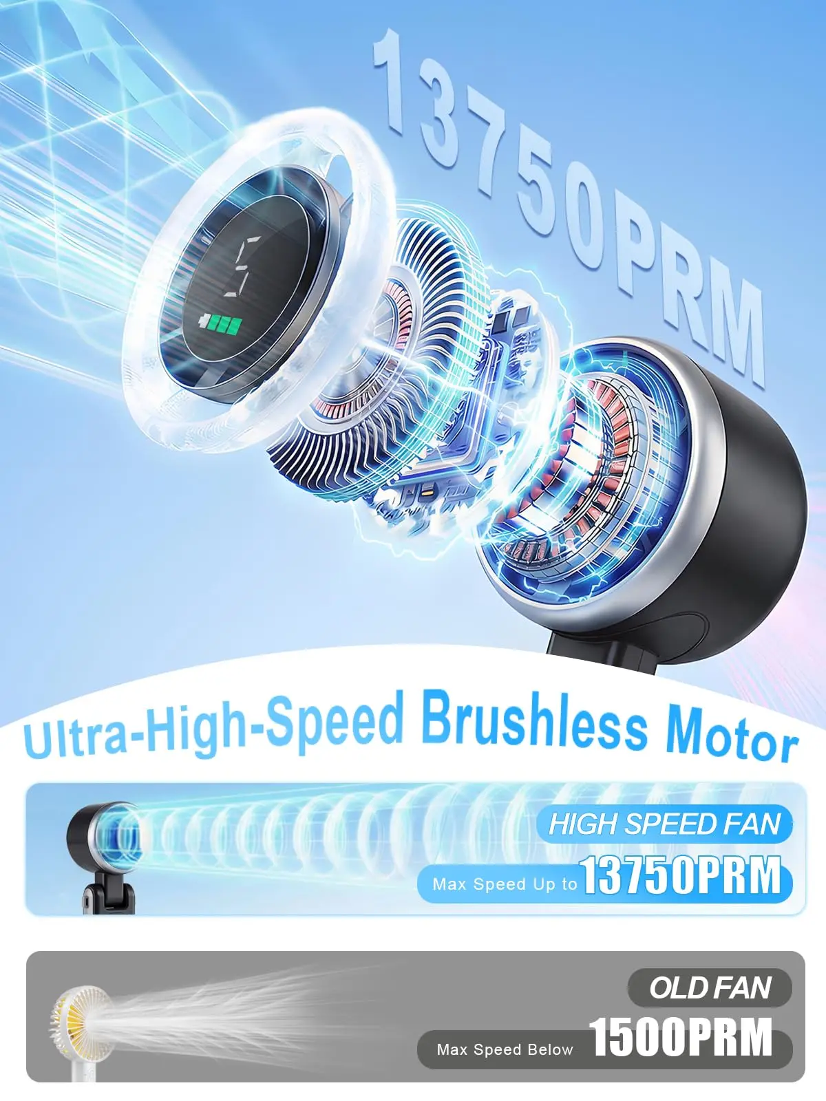 This handheld turbo fan features an advanced 6-blade design and a high-speed three-phase brushless motor, delivering a maximum wind speed of up to 10 m/s and a top speed of 13,750 rpm — 3 times stronger than ordinary handheld fans. Perfect for staying cool on hot journeys.