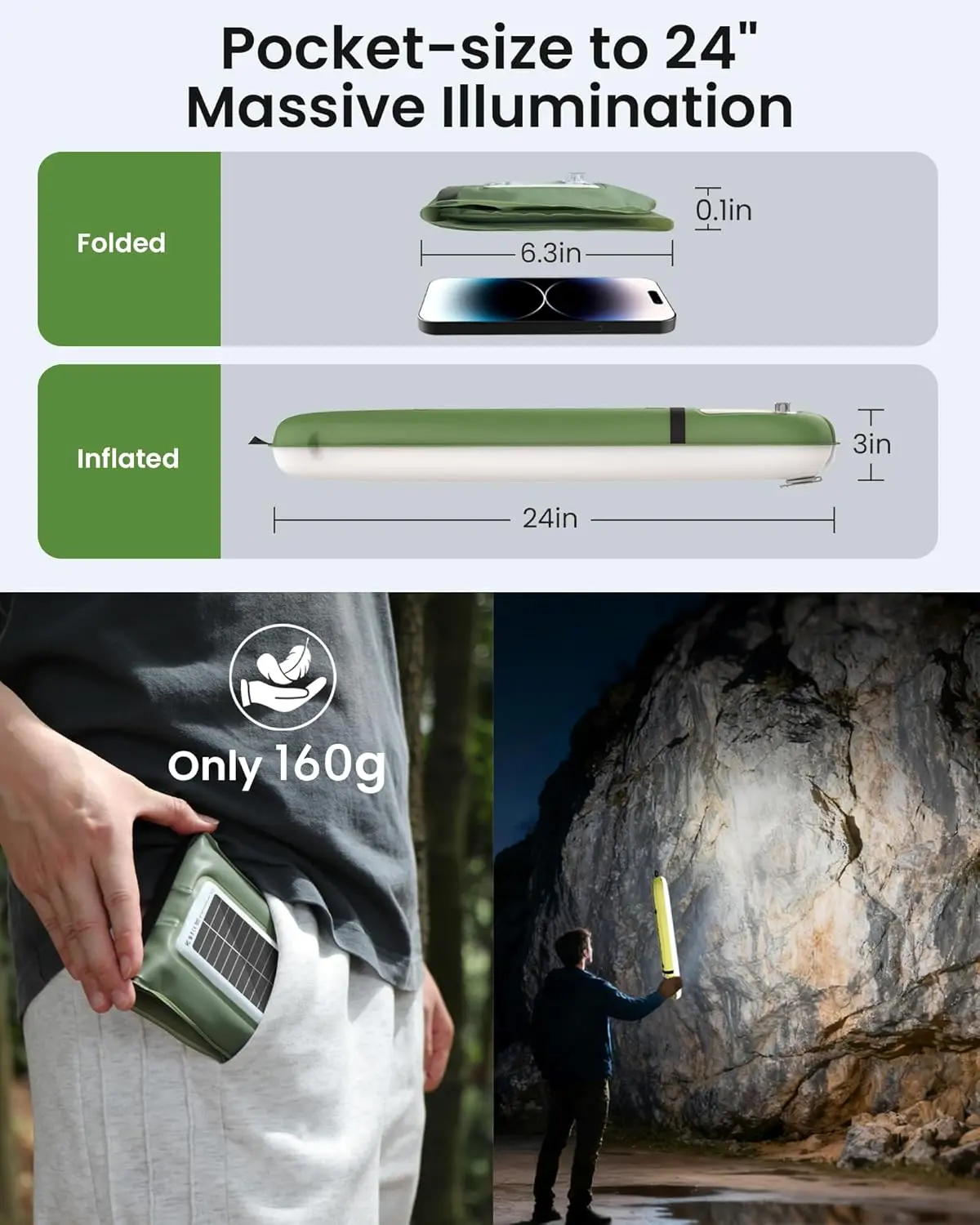 ·24" Inflatable Camping Lantern & Massive Illumination: Ditch bulky, heavy lanterns for backpacking. This inflatable camping light packs down to the size of a smartphone, saving precious backpack space. In just 5 seconds, it inflates into a 24-inch ultra-bright light tube, casting a wide 360° glow that illuminates entire family tents or large campsites effortlessly.