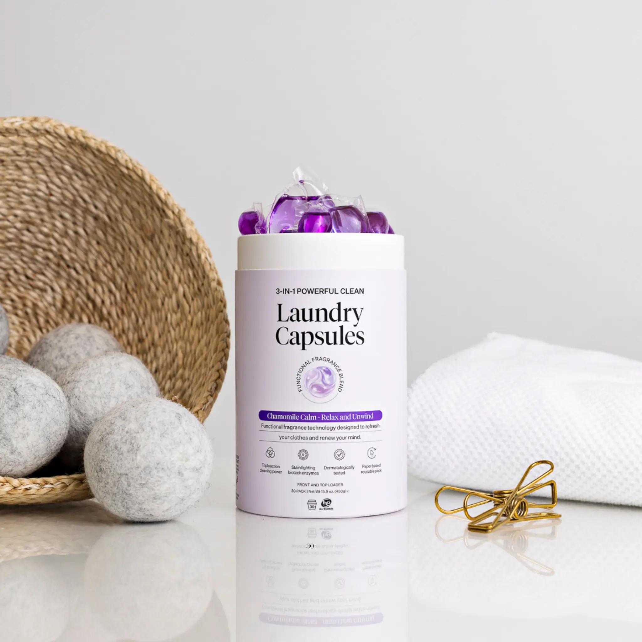 These innovative laundry capsules deliver a powerful clean while caring for fabrics and adding a calming fragrance to every wash. Powered by natural bio-enzymes, the formula tackles tough stains even in cold water and is gentle on skin. Designed with functional fragrance technology, each capsule is infused with soothing notes of chamomile, lavender, and cedarwood to help create a sense of calm and relaxation, making them perfect for freshening bedding and everyday laundry alike.