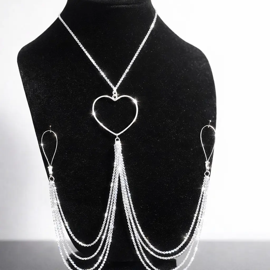 Silver Heart Non‑Piercing Nipple Necklace • Adjustable Chest Chain Jewelry • Silicone Rings