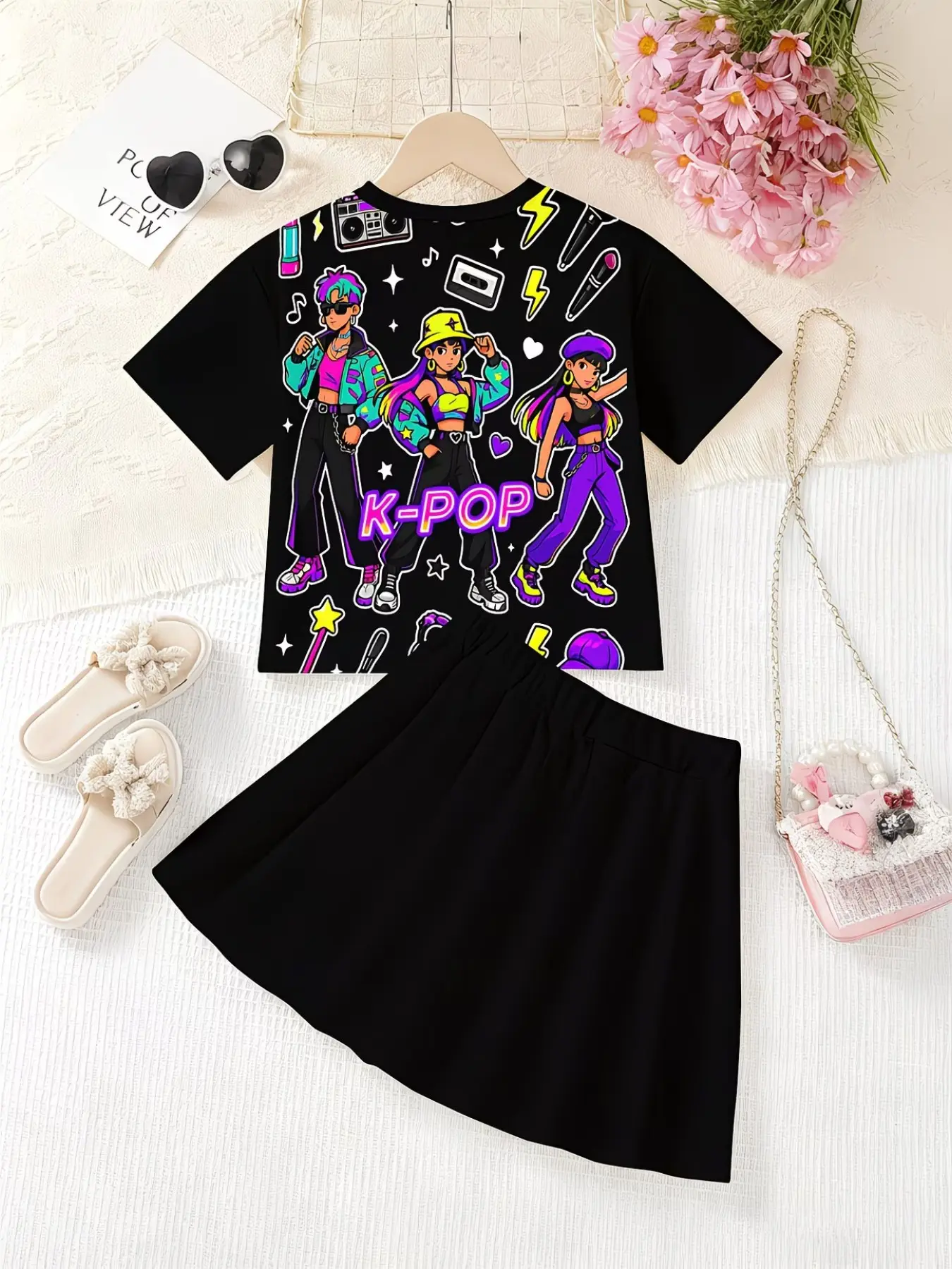 Girls' Summer Casual, Cartoon Anime 3D Print, Fashion Round Neck Short Sleeve Top + Skirt, Comfortable Summer Clothes for Kids