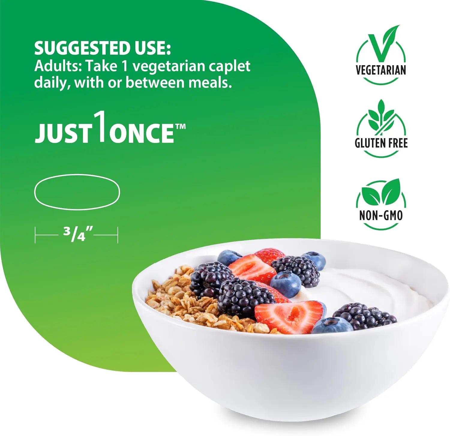 ·Simple Ingredients – Vegetarian caplets are made without wheat, gluten, milk, peanuts, eggs, fish, shellfish, artificial flavors or sweeteners.
