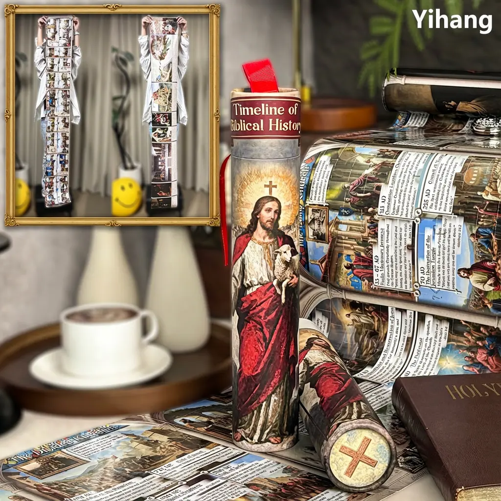 More than a simple chart, this scroll blends timeline learning with richly detailed illustrations inspired by biblical stories, sacred places, and classical artwork. The museum-like presentation adds depth and atmosphere, making study time feel more immersive and meaningful.
