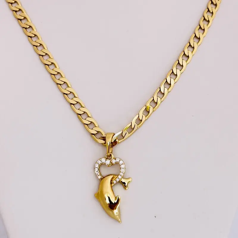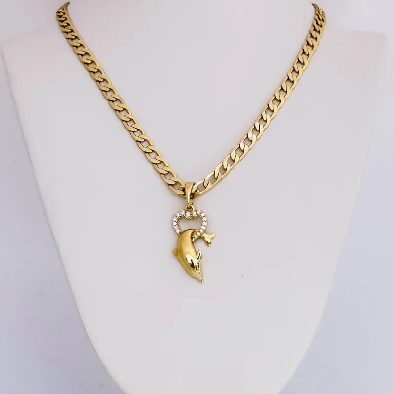 Gold Plated 14k Dolphin Heart Pendant Necklace with Rhinestones on a Chunky Chain Elegant Design for Everyday Wear or Special Events