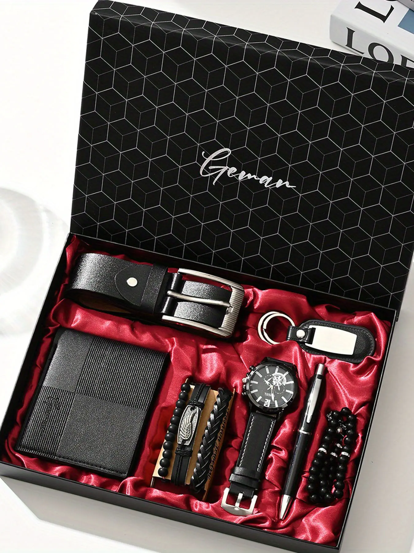 PU leather business men's watch set (wallet + belt + keychain + bracelet + watch + pen + rosary), simple quartz watch set 7pcs/set, exquisite watch gift box, suitable gift box for men
