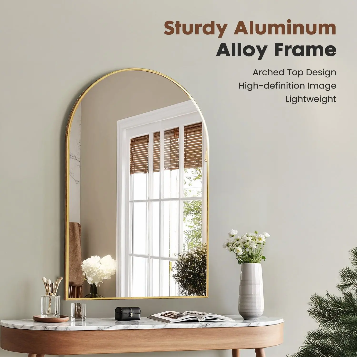 Timeless Arched Design & Premium Decor]: Elevate your interior with our chic arched vanity mirror, featuring a gracefully curved top and a sleek, slim metal frame. This design brightens rooms by reflecting more light, creating an airy, spacious feel. It serves as a stunning statement piece that adds instant sophistication and boutique-inspired elegance to modern bathrooms, chic entryways, cozy bedrooms, living rooms, or commercial spaces.[Durable & Humidity-Resistant Construction]: Built for long-lasting performance in moist environments. The frame is constructed from high-quality, rust and corrosion-resistant aluminum alloy, ensuring it thrives in steamy bathrooms or humid climates. Combined with a protective anti-fog coating, this mirror maintains its clarity and structural integrity season after season, preventing deterioration.[Safe HD Explosion-Proof Glass for Crystal Clarity]: Engineered with your family's safety in mind. This mirror features high-definition, tempered safety glass that provides razor-sharp, distortion-free