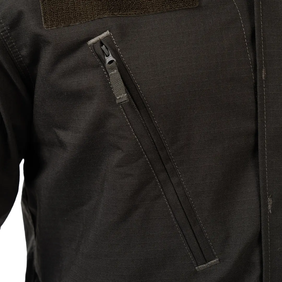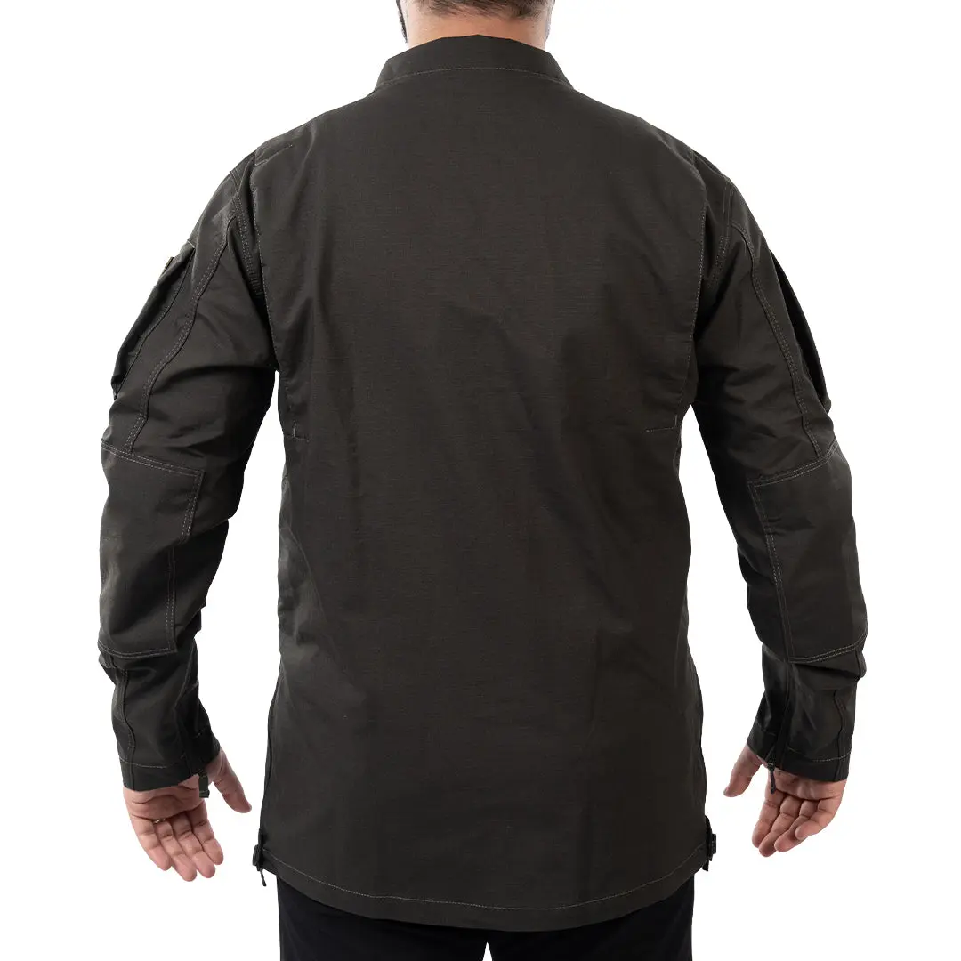 The Warden 1.0 Button-Up Long Sleeve Duty Shirt is designed for extended wear, focusing on durability, breathability, and freedom of movement. It is made from a cotton and polyester ripstop fabric reinforced with Lycra to support stretch while maintaining resistance to tearing and abrasion.