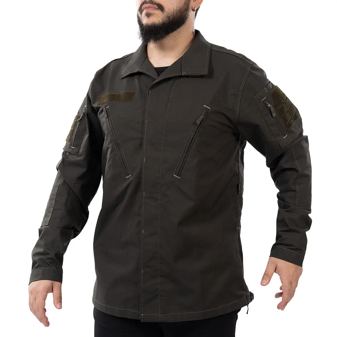 Dual side zippers provide quick access to carried items and allow additional ventilation when needed. Sleeves feature adjustable width through a zipper system and include upper arm pockets with hook and loop panels, along with dedicated compartments for pens or eyewear. The overall cut allows natural movement through the shoulders and arms without restriction.