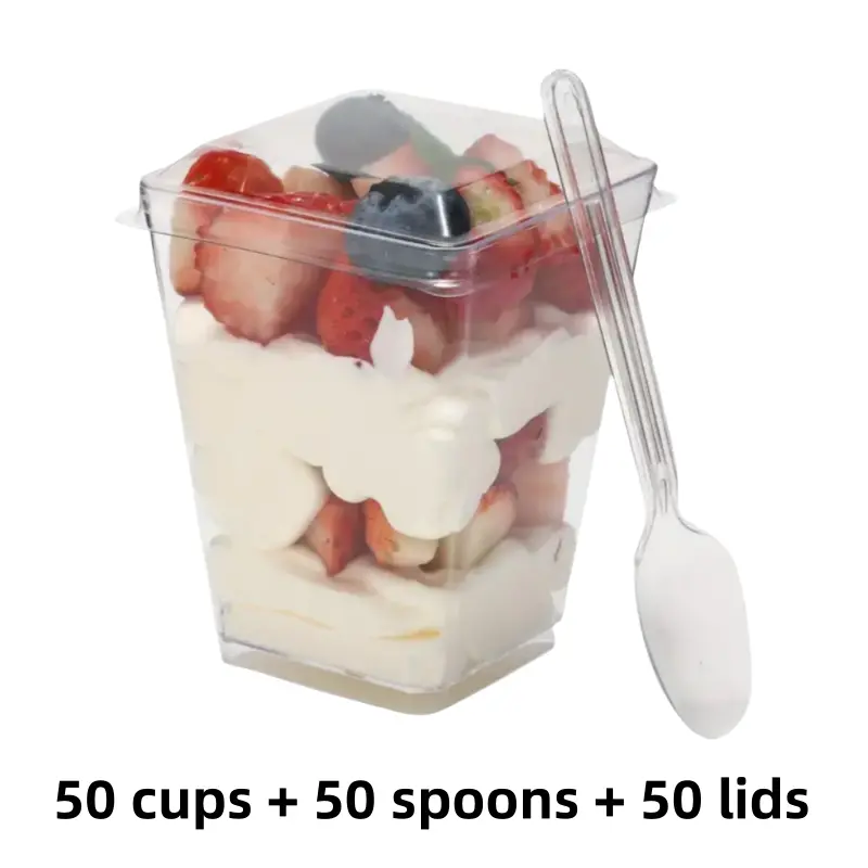 VALUE COMBO SET: Our package includes 50 clear dessert cups, 50 cup lids, and 50 spoons.