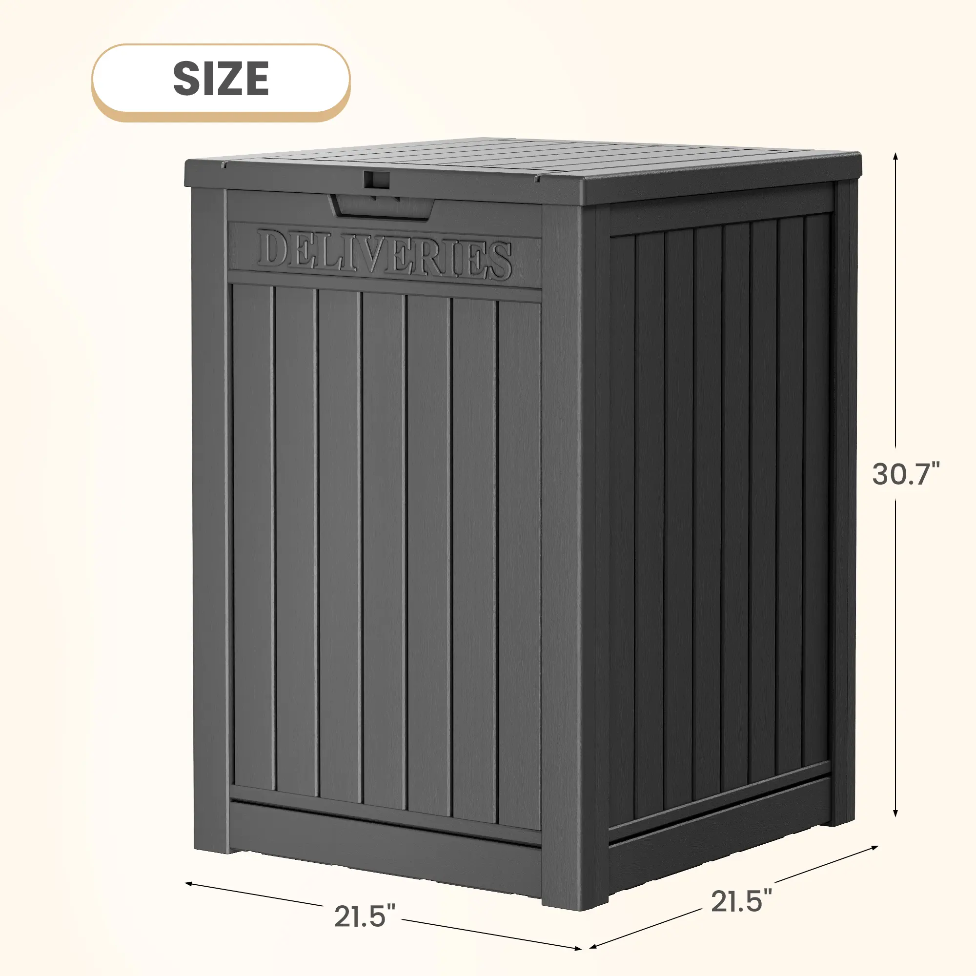 This package delivery box measures 21.5" × 21.5" × 30.7" and offers an internal volume of 51 gallons, providing plenty of space for multiple everyday packages.