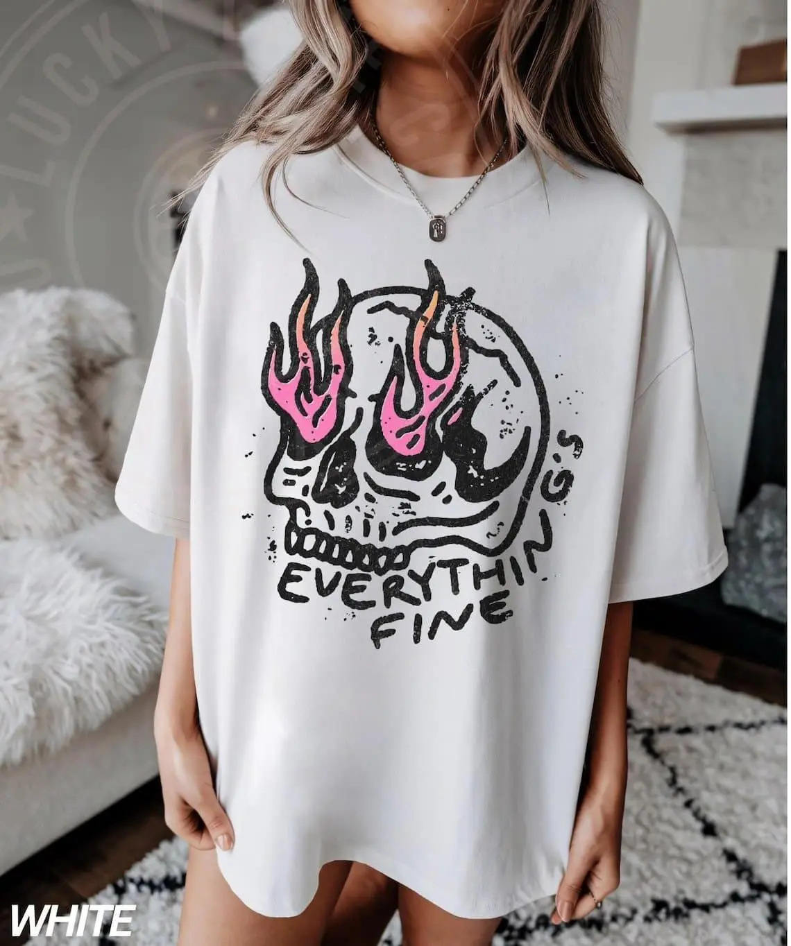 [Sale off up to 50%] Everything is Fine Shirt, Retro Grunge Shirt, Sarcastic, Funny Skeleton, Festival, Rebel Tee, Pink Flames, Graphic Streetwear T-shirt