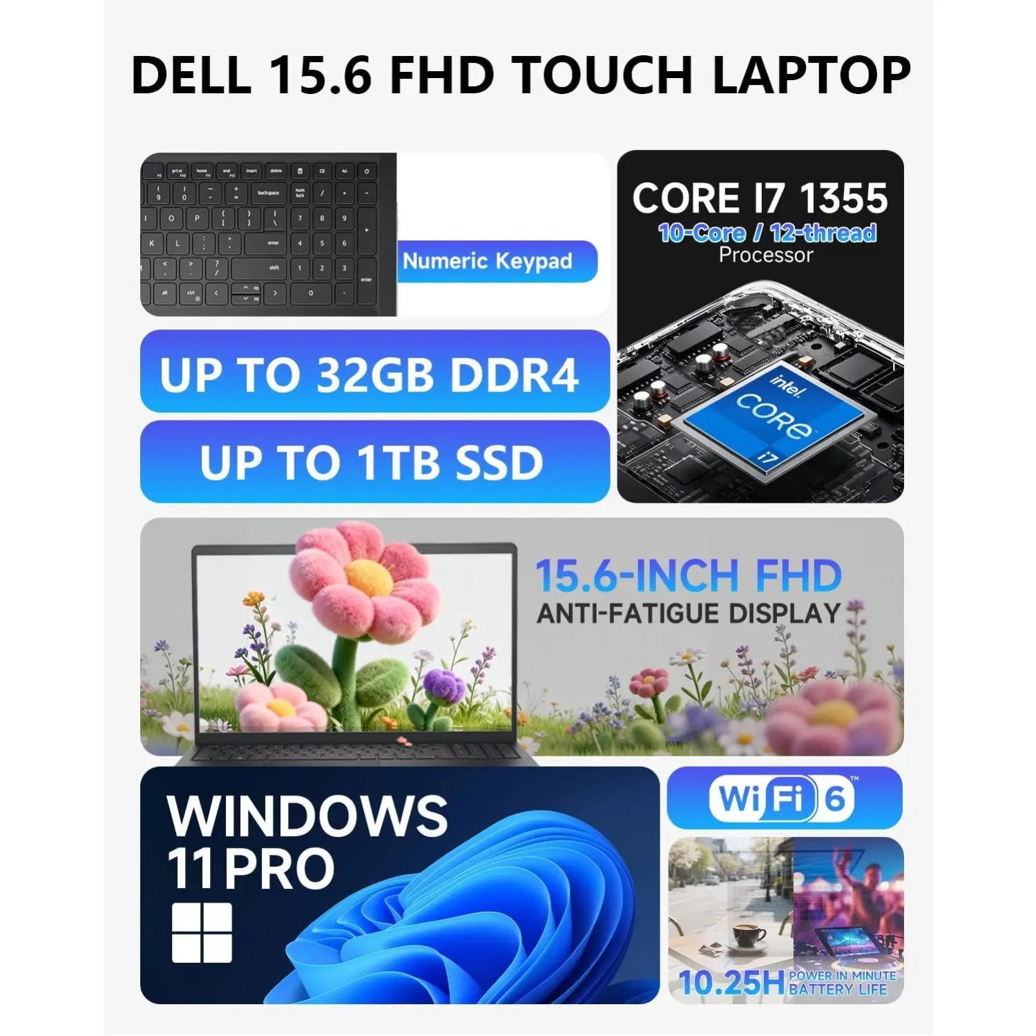 ·🚀 Pro-Level Performance with 13th Gen Intel Core i7 Work faster and more efficiently with the Dell 15 laptop powered by the 13th Gen Intel Core i7-1355U processor. With 10 cores and speeds reaching up to 5.0GHz, it’s built to handle demanding business software, creative workloads, and heavy multitasking. This system keeps your workflow smooth and responsive from morning to night.