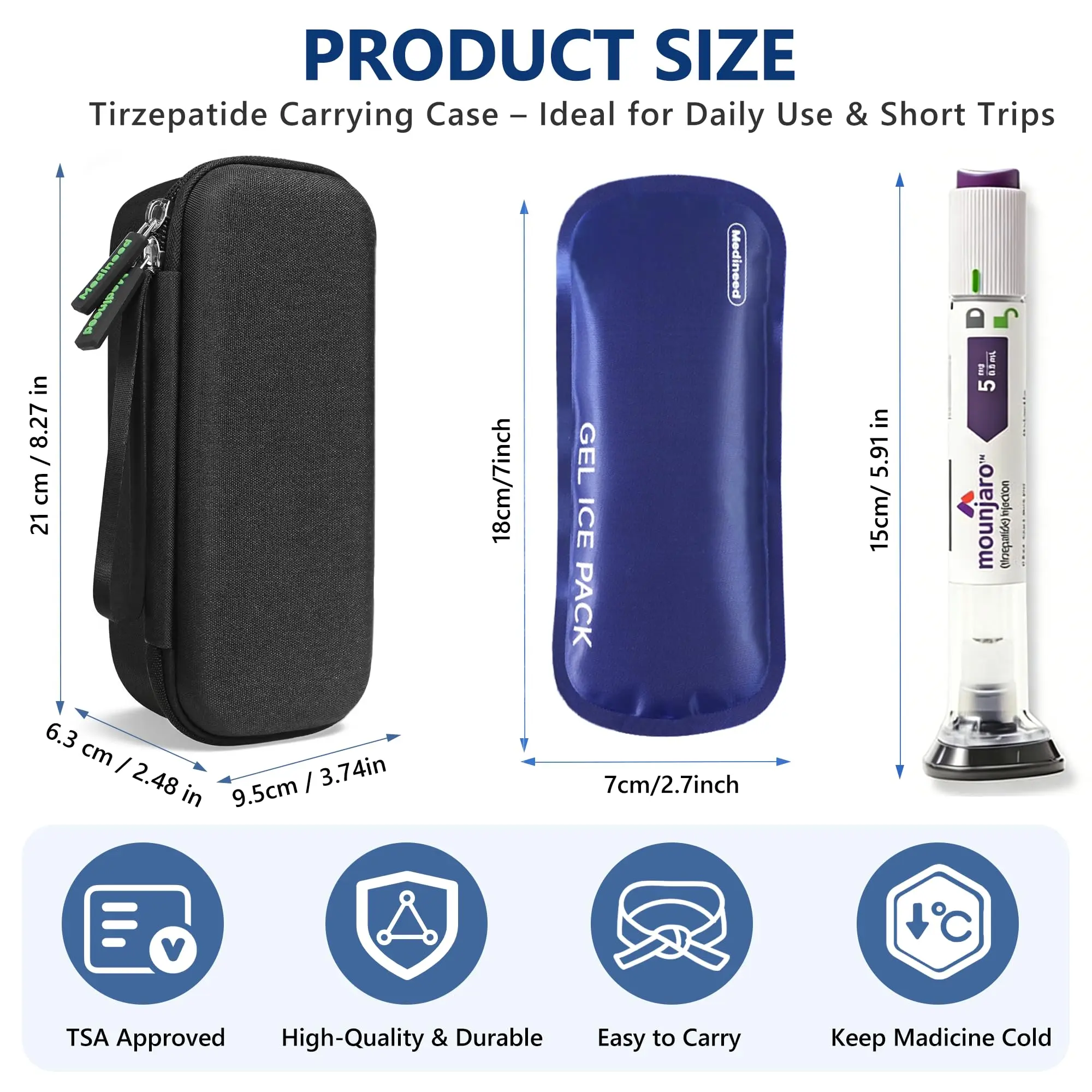 ·[Thoughtful Design] Tirzepatide pen travel case TSA approved features a large transparent mesh pocket for needles, cotton pads, and medication accessories. Measuring 8.27 × 3.74 × 2.48 inches, it is easy to carry with the handle, and the sealed zipper adds extra protection