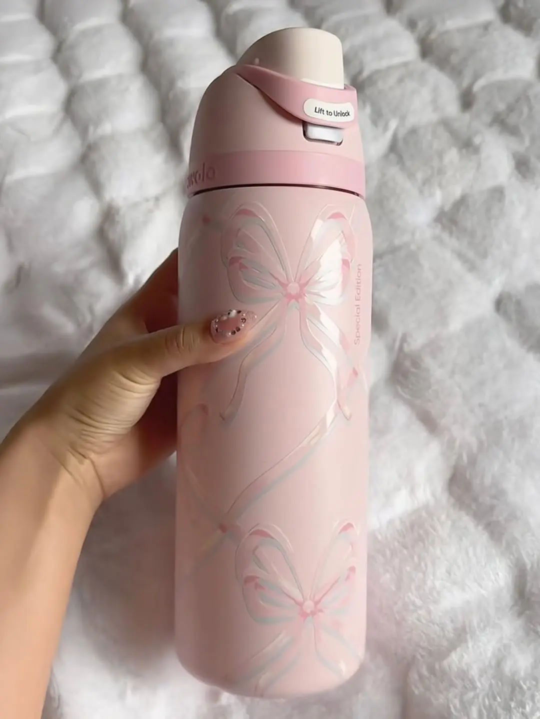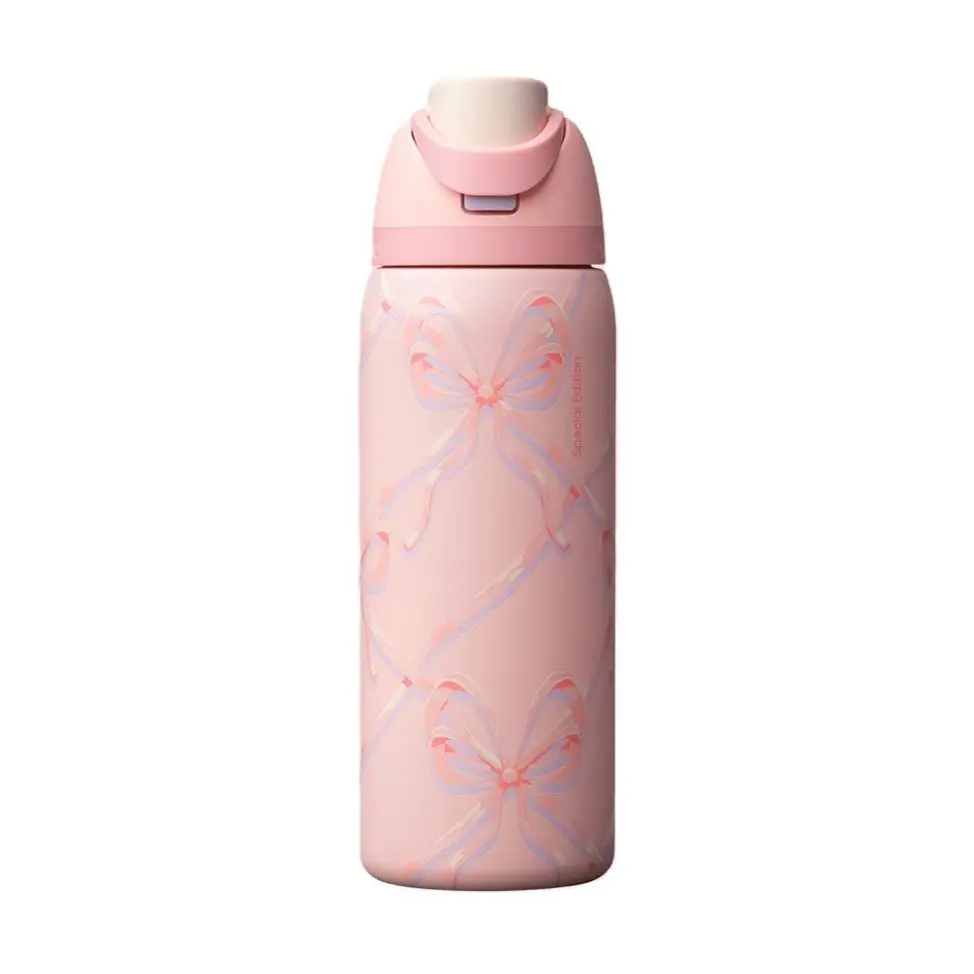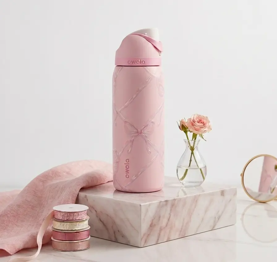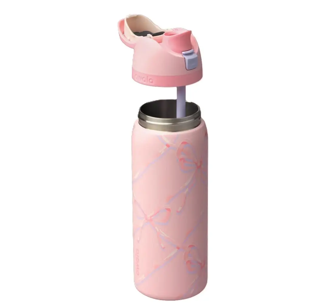 This Owala Pink Bow Holiday Version is a 32Oz stainless steel insulated water bottle. Ideal for festive occasions, it keeps your drinks at the perfect temperature. The pink bow design adds a festive touch to your hydration routine. Stay hydrated in style this holiday season.