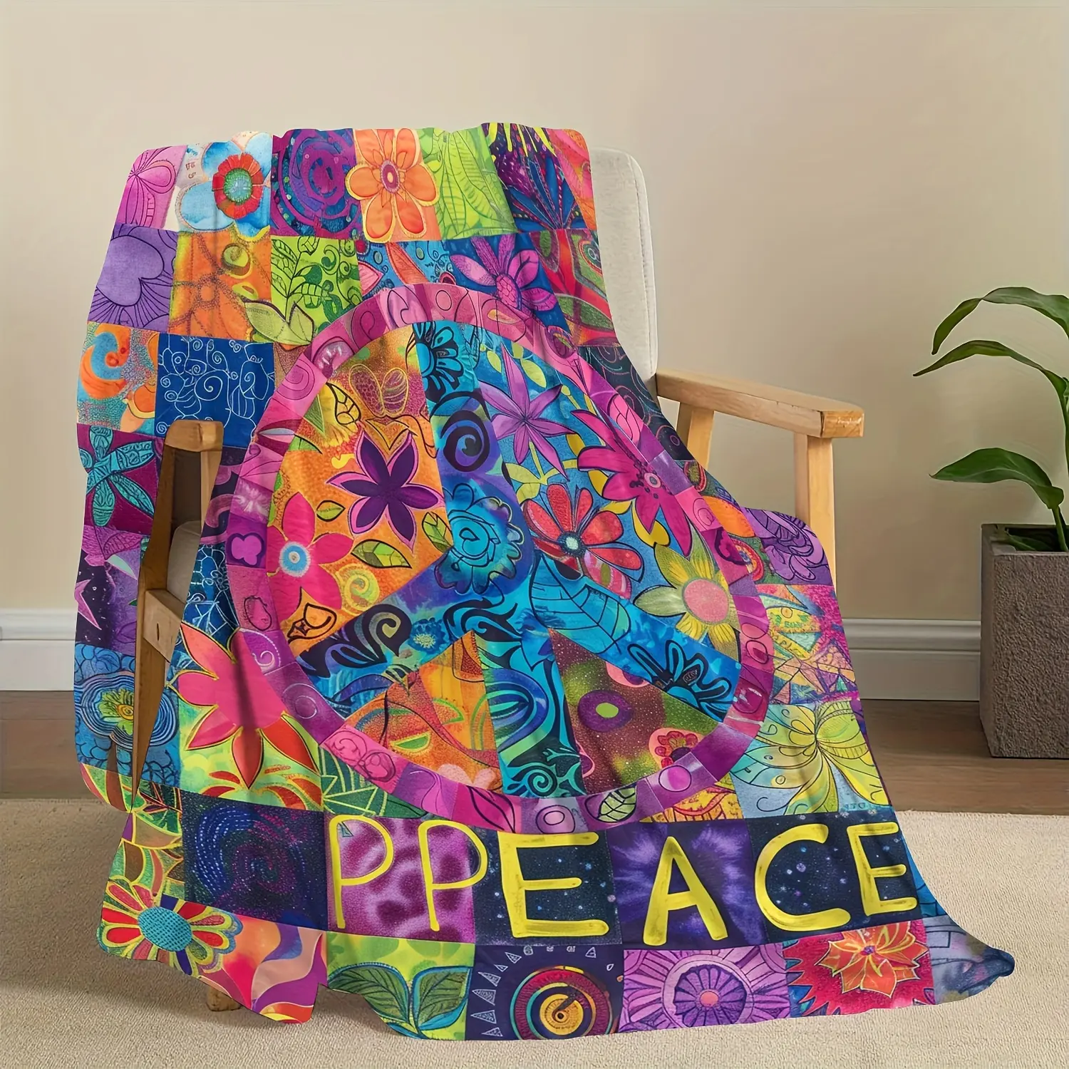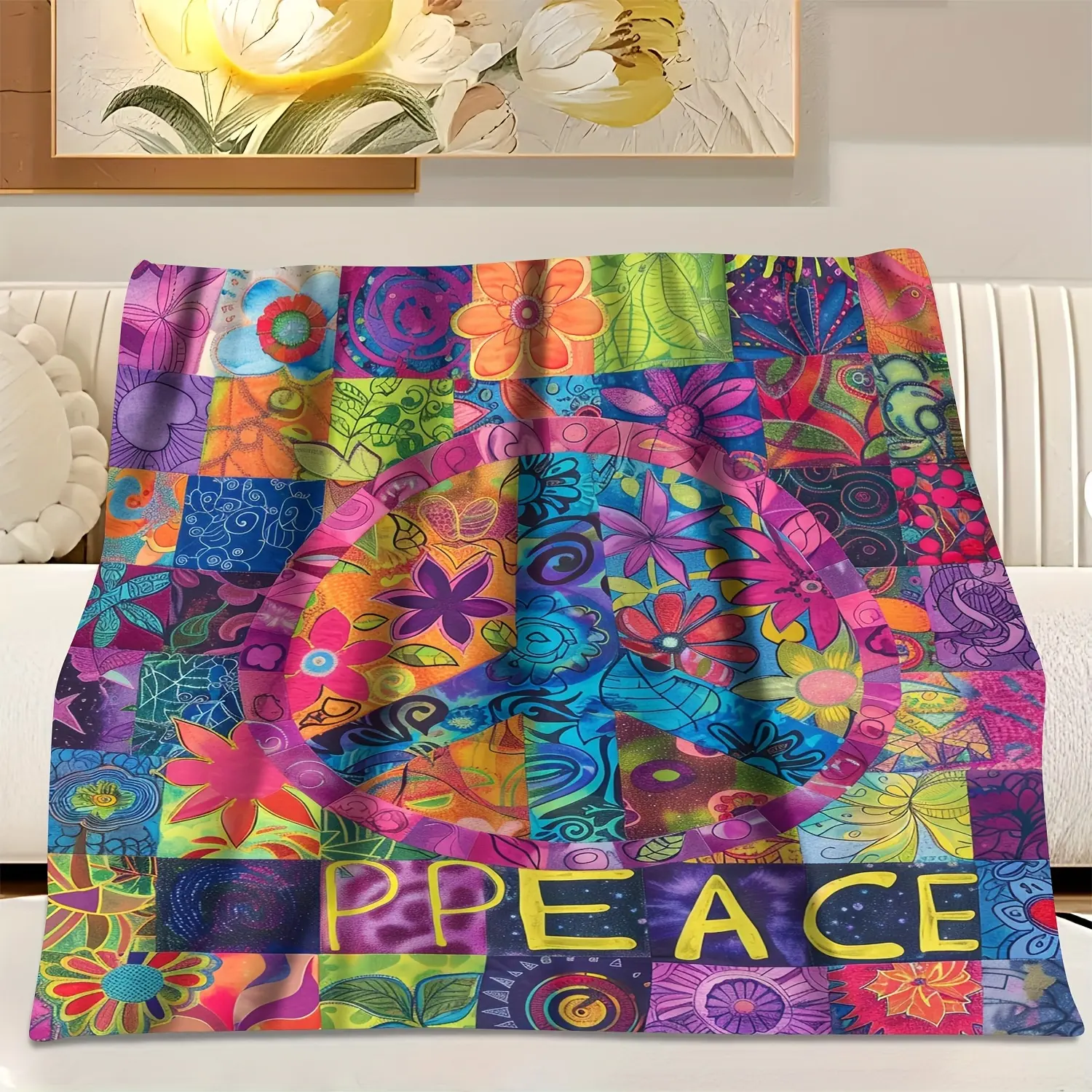 Cozy Flannel Throw Blanket - Vibrant Flower & Peace Sign Patchwork Print - Lightweight All-Season Soft Knitted Bedding - Perfect for Couch, Bed, Camping & Travel - Great Gift for Her or Him