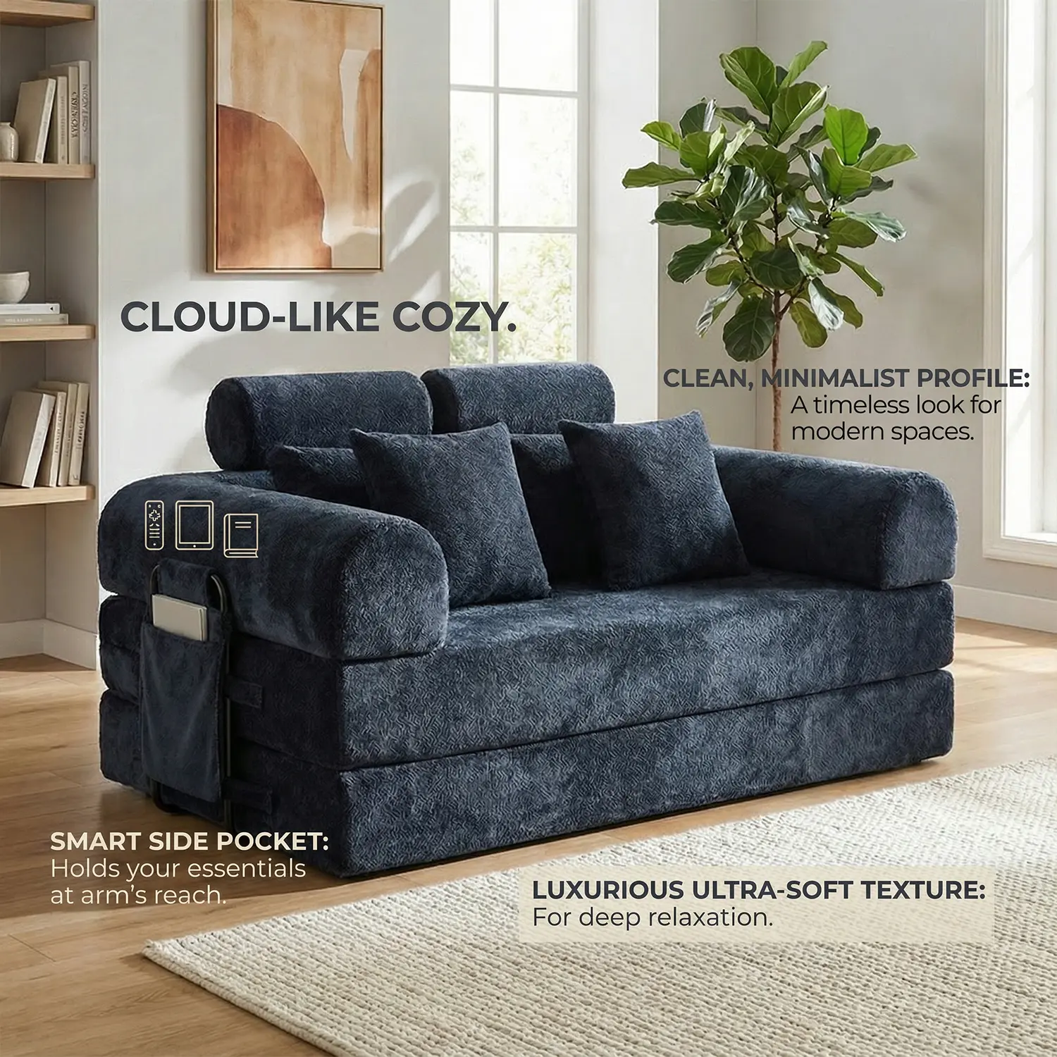 Large size double boneless convertible folding sofa bed with fixed shape frame and storage bag. Headrest design with pillow for dual comfort
