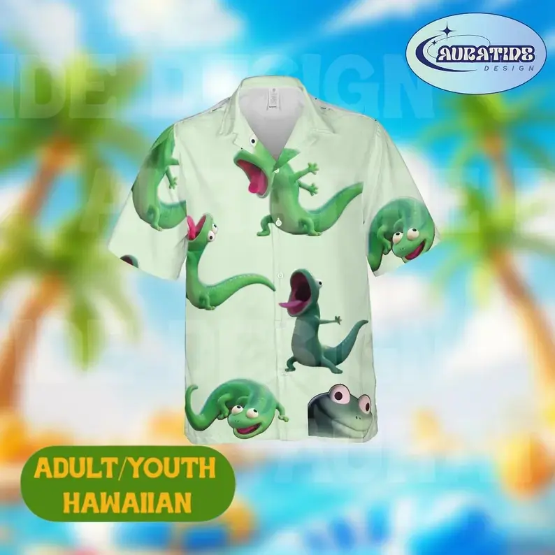 Funny Green Chameleon Hawaiian Shirt Shorts Set Adult Youth Men Women Cute Cartoon Lizard Beach Outfit Summer Loose Casual Aloha Matching Tropical Vacation Gift