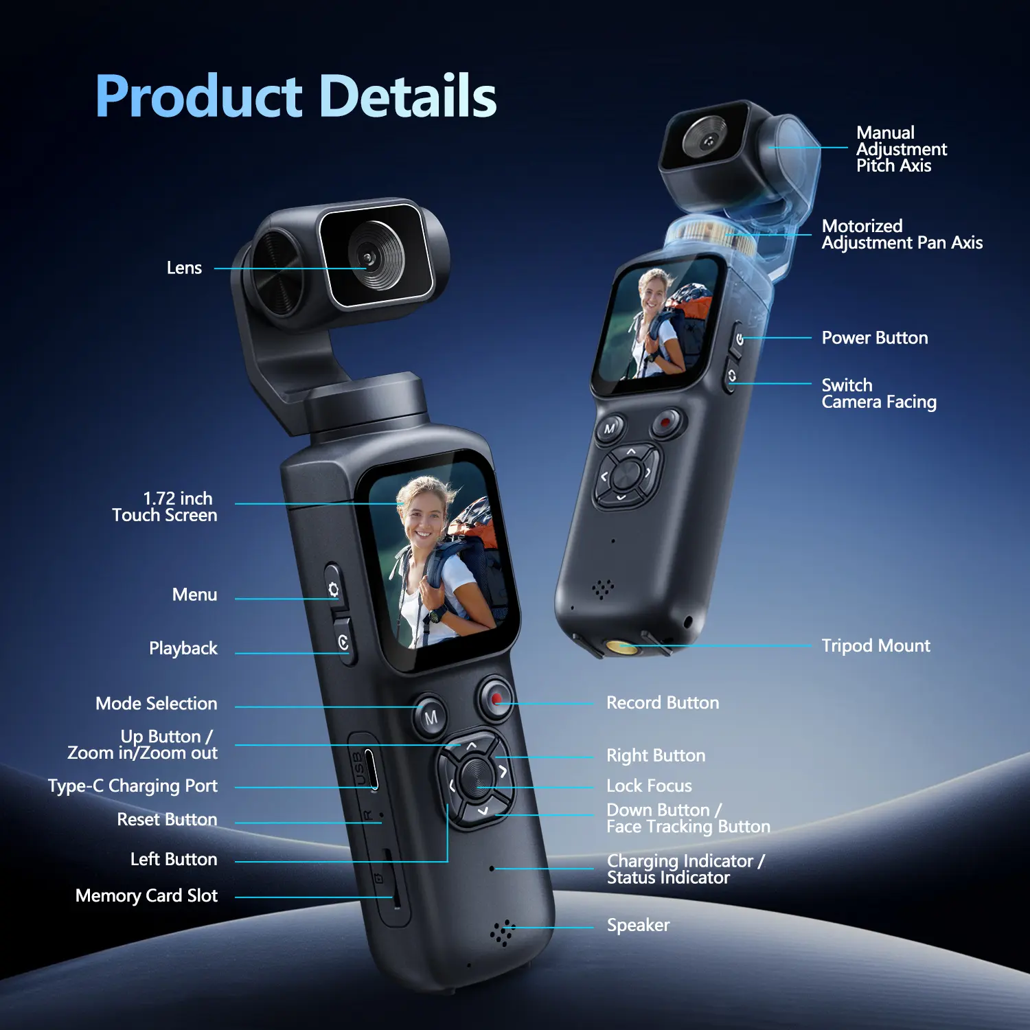 The Lmzour 4K Vlogging Camera follows your face automatically, ideal for solo creators and TikTok videos. Flip, rotate, and capture from any angle without adjusting your position. Shoot crisp 4K videos and ultra-clear photos for YouTube and everyday moments. Lightweight and compact, it's perfect for travel and vlogging.