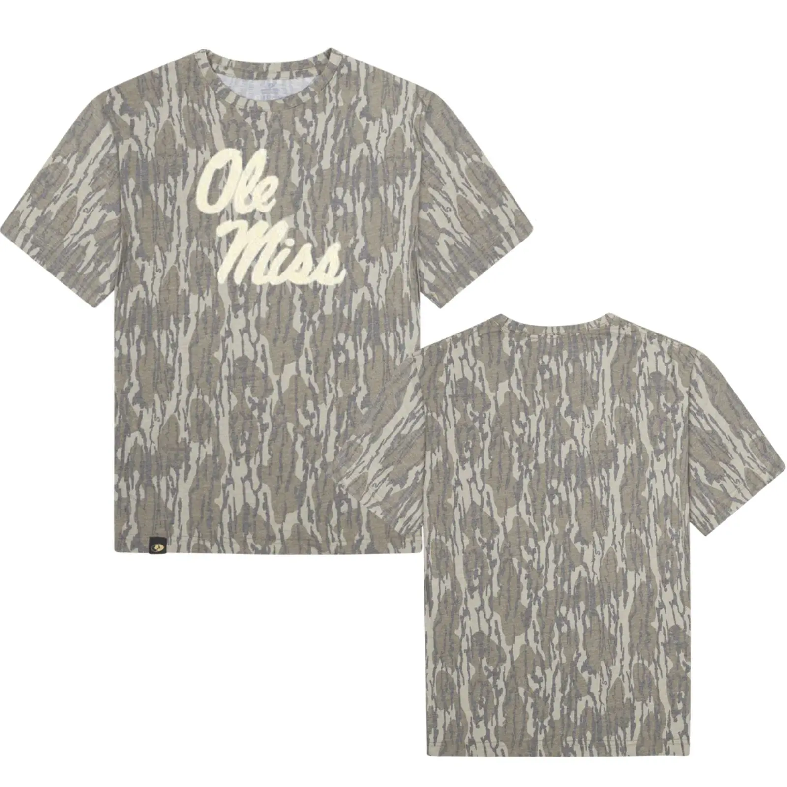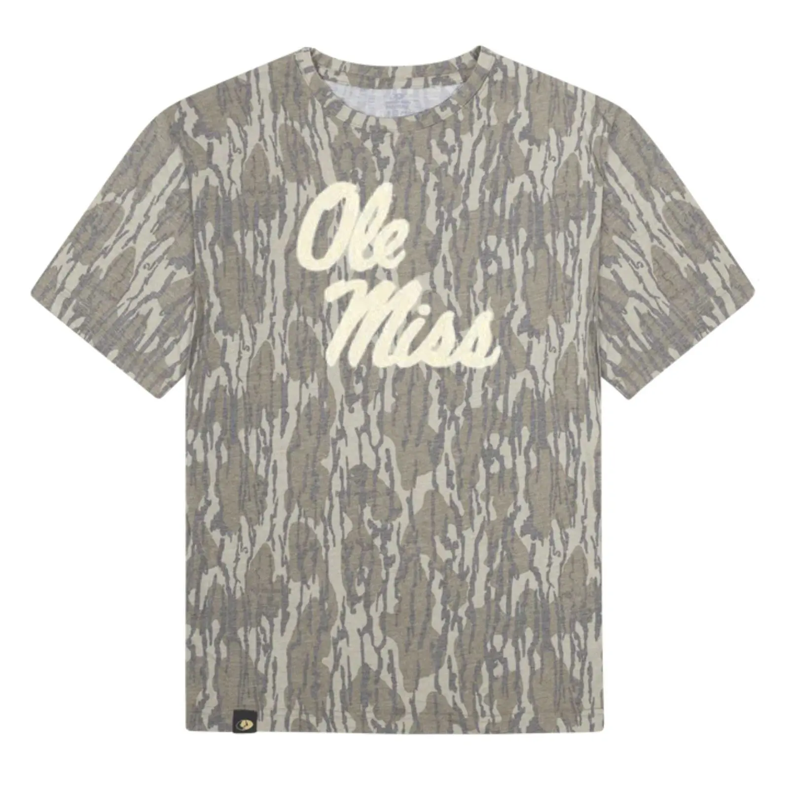 White OLE MISS Designed On Original Bottomland Pattern Tshirt, Mossy Oak OLE MISS Bottomland Camouflage Camo Tee