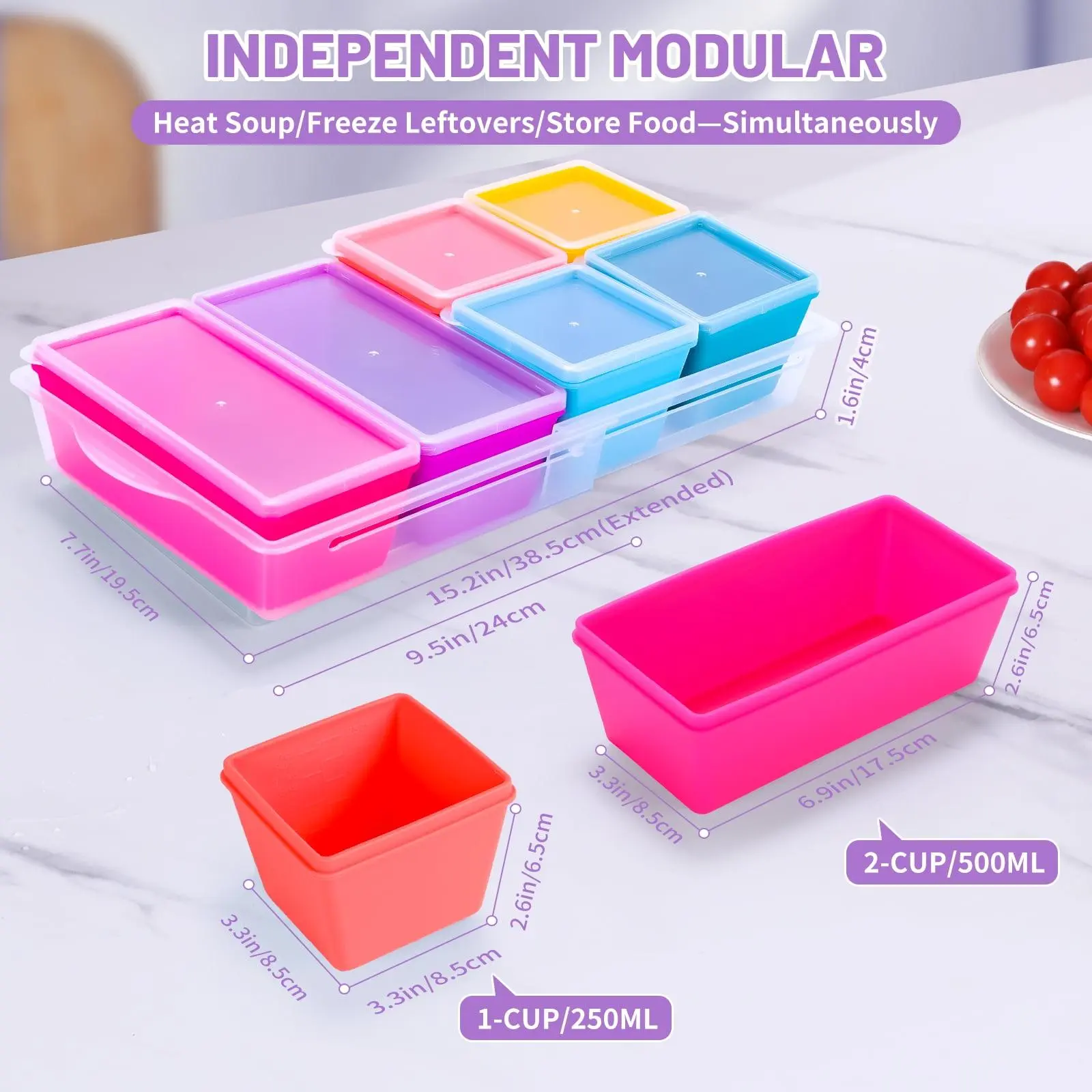 Modular Soup Freezer Cubes Set: Includes 4x 1-cup containers and 2x 2-cup containers with storage base. Ideal for portioning, storing, and freezing large batches of homemade meal prep simultaneously. All trays are separate for easy cleaning, dishwasher safe