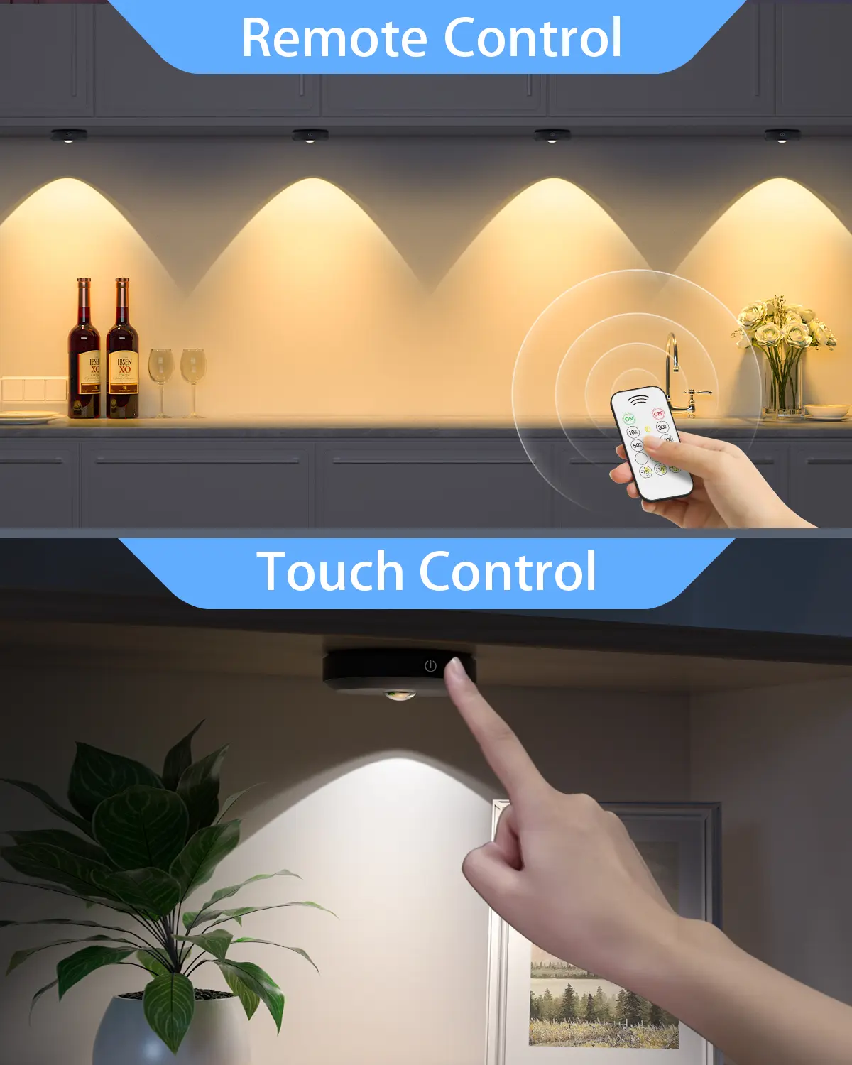 The under cabinet lights offer two control options: touch control and remote control. A short tap lets you turn the lights on/off or switch between colors, while a long press adjusts the brightness. The remote also features a timer, allowing you to set the rechargeable puck lights to automatically turn off after 15, 30, or 60 minutes. These tap lights are an excellent choice for cabinet, countertop, closet, or shelf lighting.🌟