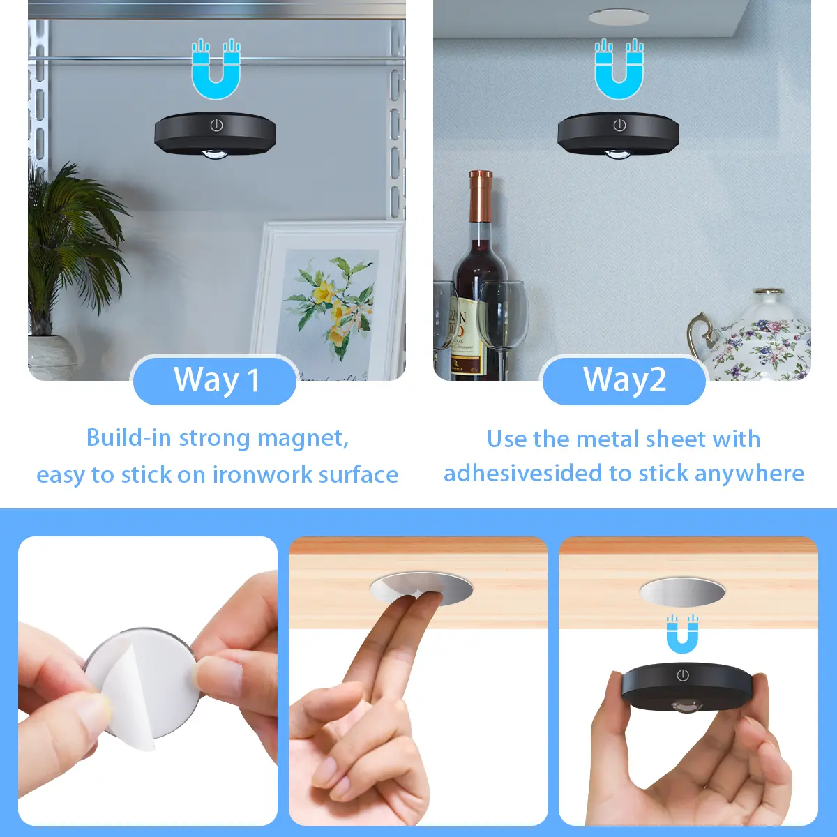Method ①: Each wireless under cabinet lighting comes with magnetism, just attach the lights to iron products. Method ②: Equipped with a sticker mounting disk, install in 3 seconds at any where you want. Easily take the magnetic tap lights off, wireless portable for anywhere, for closet, cabinet, bedroom, kitchen