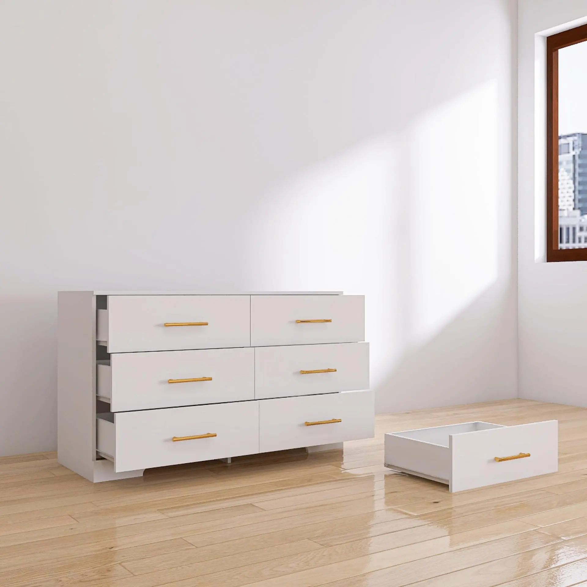This large black 6-drawer dresser offers ample storage space, perfect for bedrooms, guest rooms, or kids' rooms. The golden handles add a modern farmhouse charm. Made from engineered wood (MDF/particleboard) and decorative laminate, it blends seamlessly into any setting. The matte black hardware enhances its minimalist style. Ideal for storing clothes and essentials, it offers ample space without compromising aesthetics.