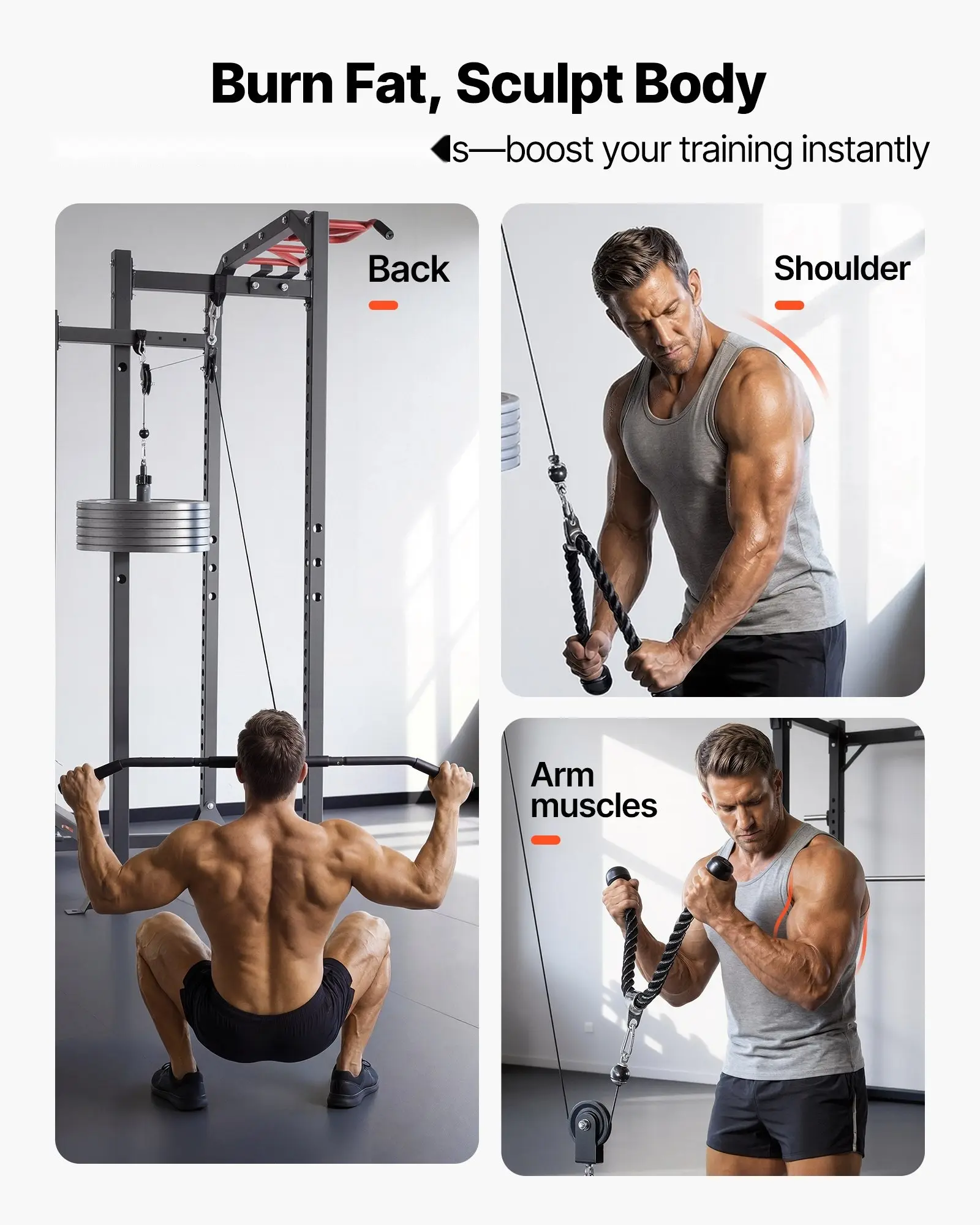 ·Universal Effective Shaping: This lat and lift pulley system targets back, shoulders, and arms, helping build strength and improve posture. Whether you're a beginner or a fitness enthusiast, toning or muscle gaining, it makes cable training simple for all