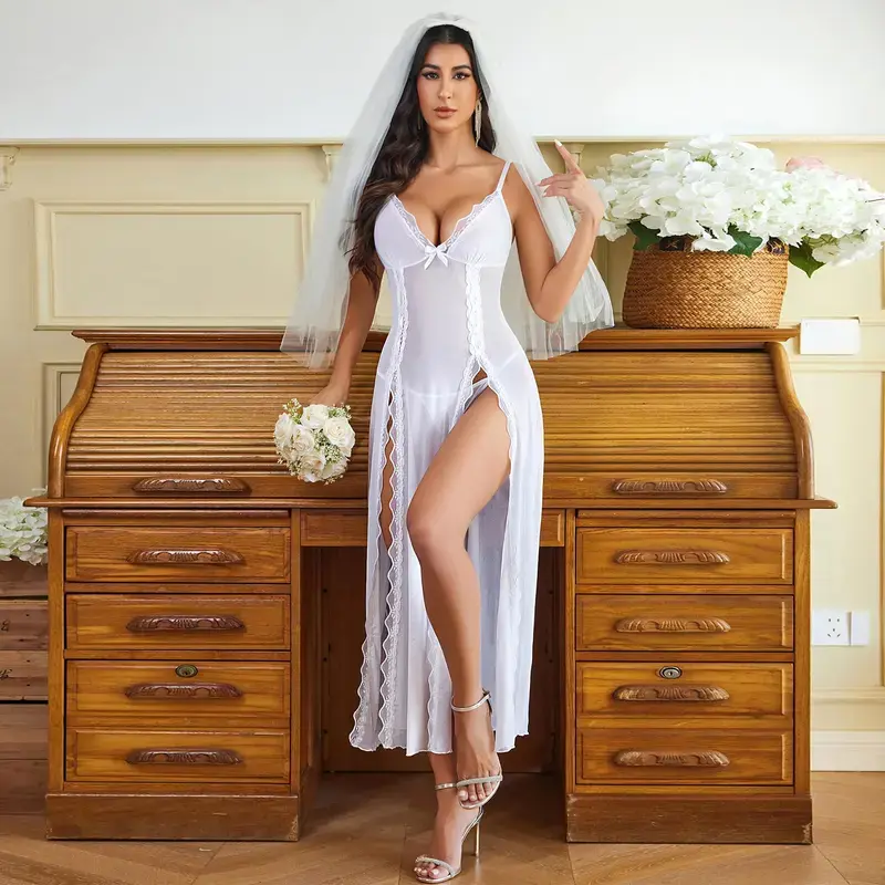 The nightdress boasts a beautiful floral lace bust and a plunging V-neckline. Dual side slits with lace trim details highlight your silhouette. Adjustable thin shoulder straps ensure effortless wear. Floral motifs enhance your allure and femininity, making you irresistibly captivating.