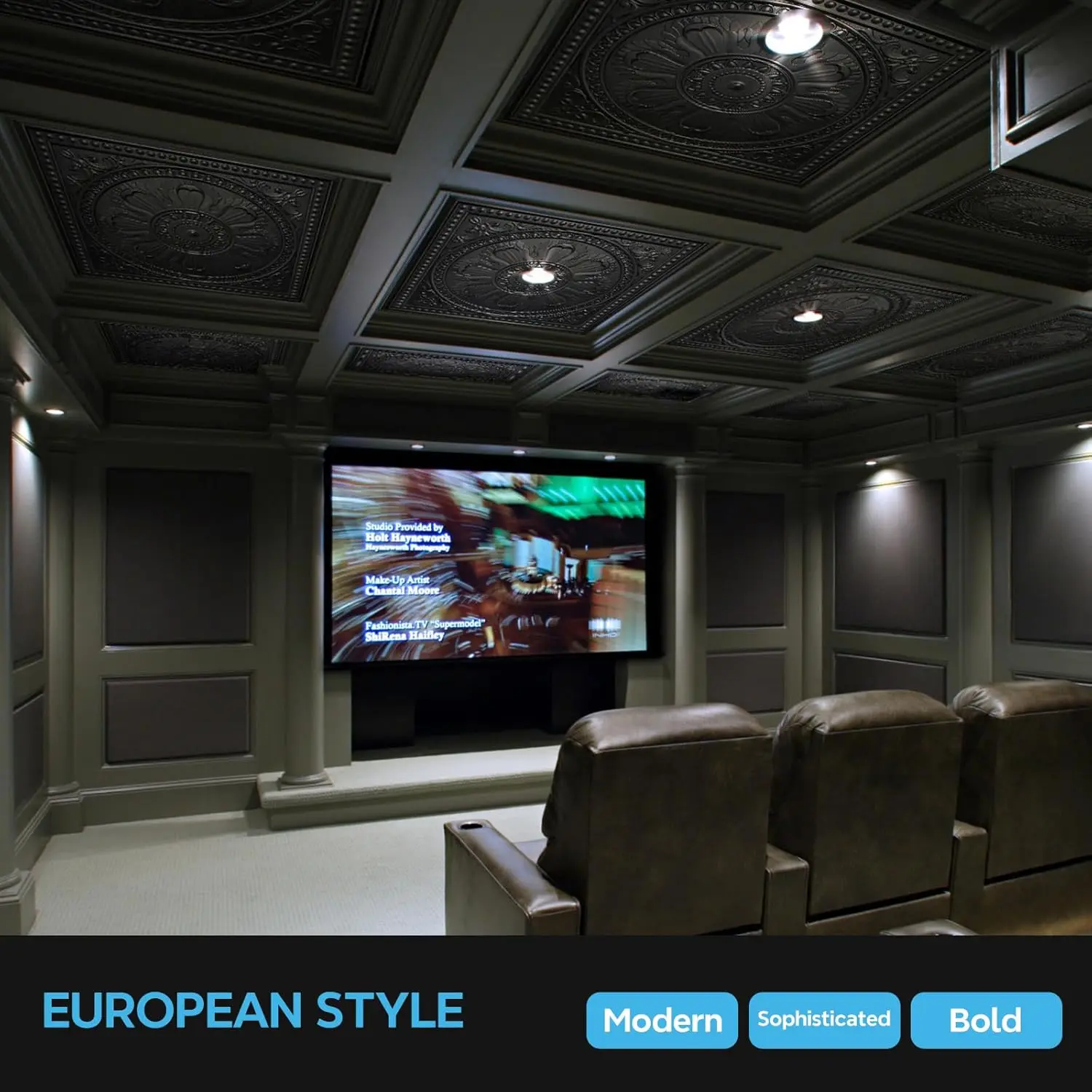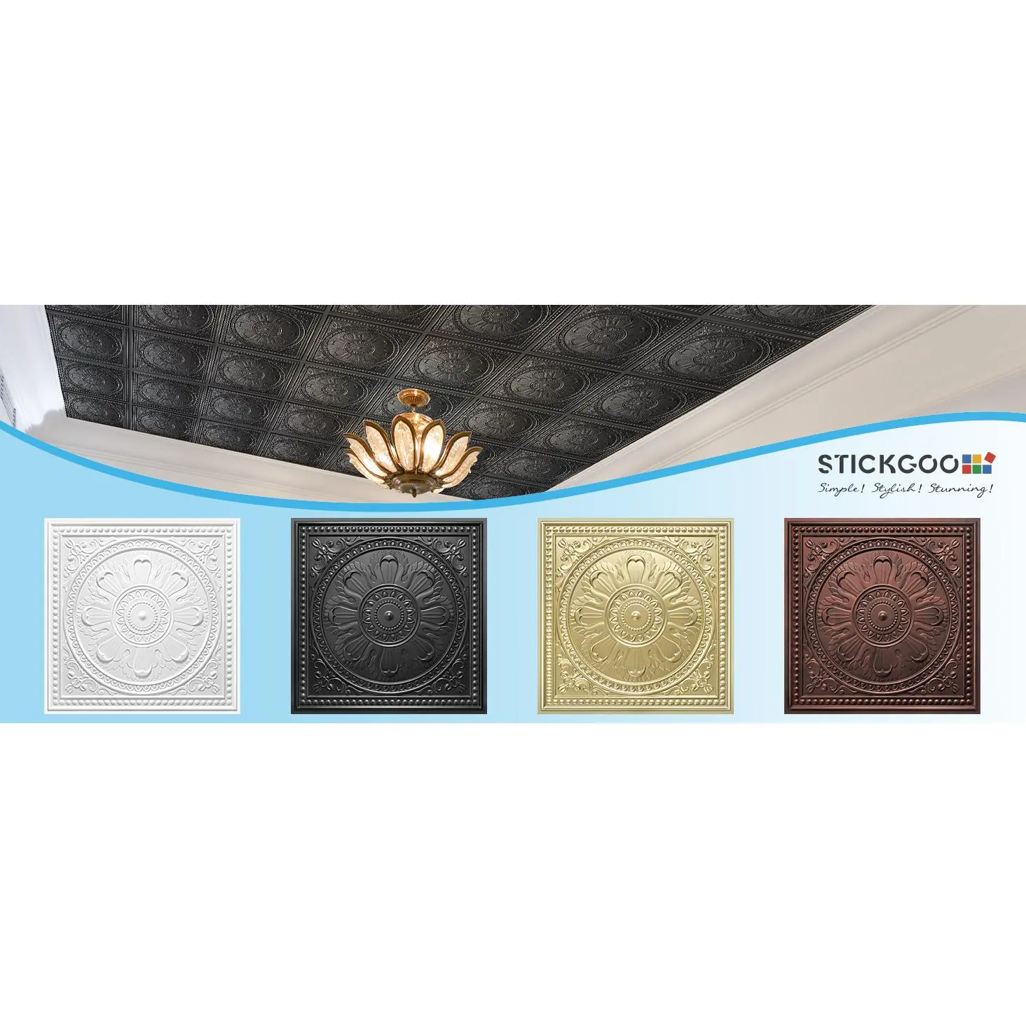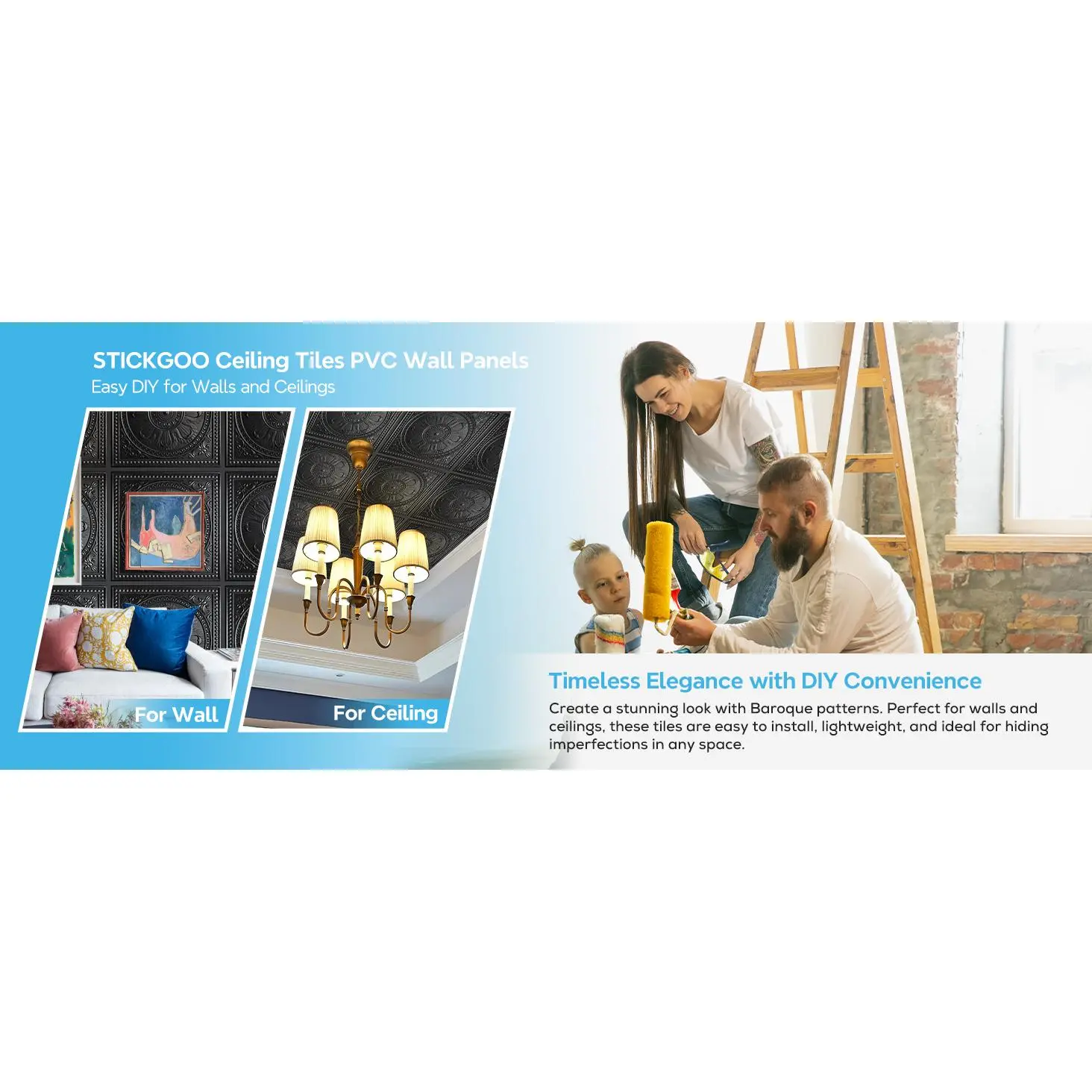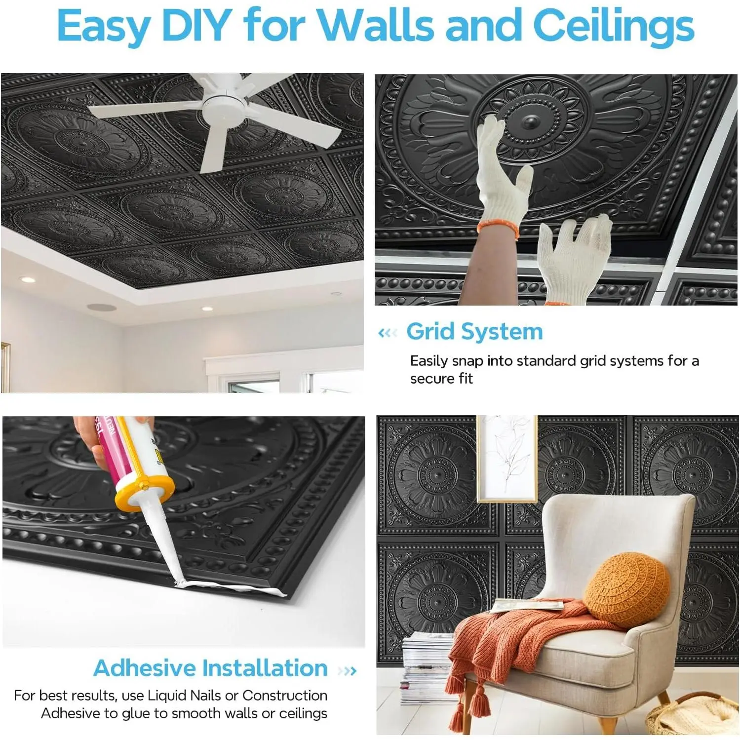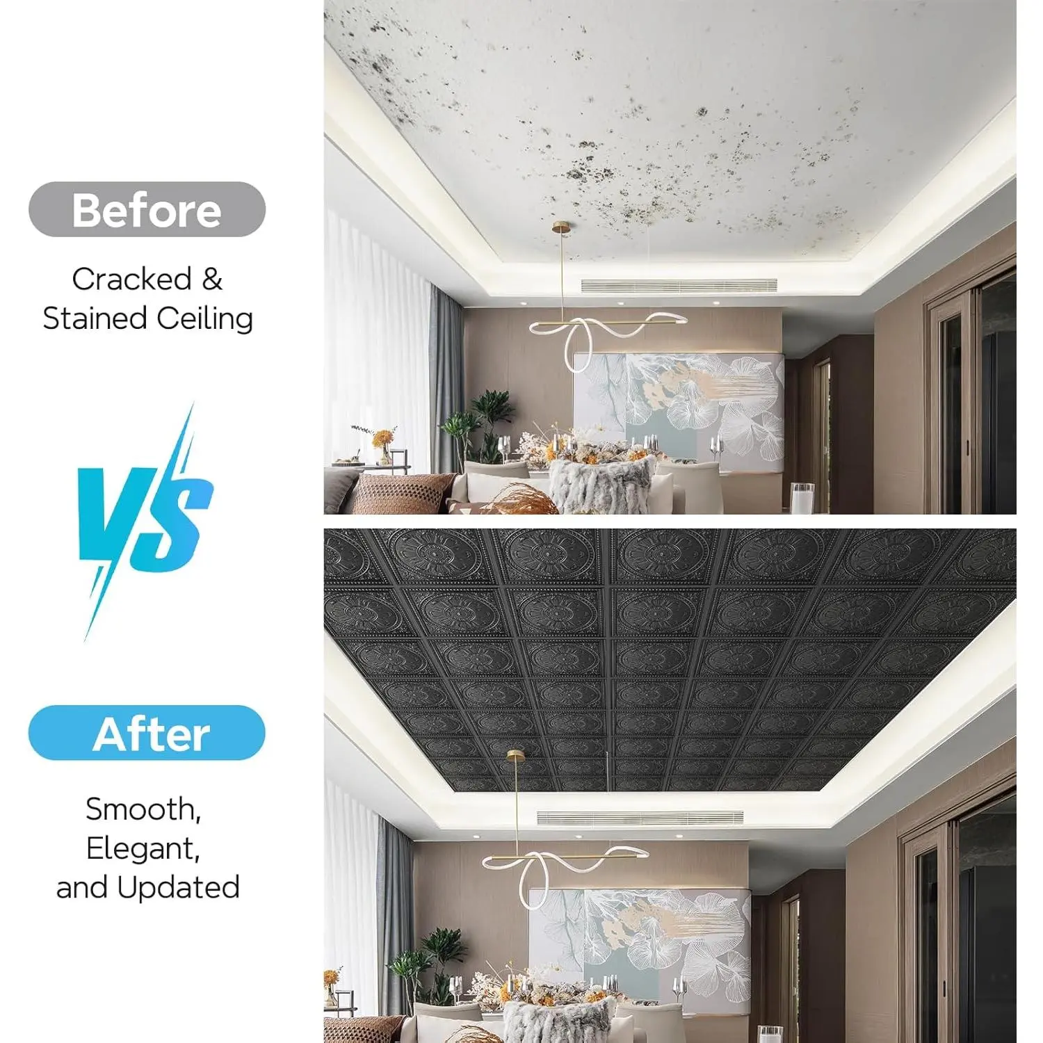 [Transformative Design to Hide Imperfections]Our tiles are expertly crafted to conceal imperfections such as cracks, stains, or discoloration on ceilings and walls.Whether covering up aging features or updating a room's look, these tiles provide a quick, hassle-free solution to effortlessly transform any space.[Premium PVC: Durable, Waterproof, and Low-Maintenance]Made from high-quality PVC, these tiles are waterproof, paintable, and resistant to cracking, fading, or warping.Safe for moisture-prone areas like kitchens, bathrooms, and basements, they are easy to clean-just wipe with a damp cloth to keep them looking brand new.[Effortless Installation for DIY Enthusiasts]Compatible with standard 15/16" T-bar grid systems or easily glued onto flat surfaces.These lightweight, flexible tiles can be precisely cut with scissors or a utility knife, making installation quick and easy-even in tight spaces or around light fixtures.[Versatile Elegance for Any Space]Perfect for both walls and ceilings, these glue up ceiling tiles add sophistication to homes, offices, restaurants, or boutiques.With intricate patterns and striking finishes, they enhance both residential and commercial settings.[Cost-Effective Coverage for Large Projects]Each pack includes 12 pvc panels (2x2 feet each), covering 48 sq.ft. With fewer packages needed, these tiles offer an affordable way to achieve high-end, luxurious results. Delivered in secure packaging to ensure flawless quality.