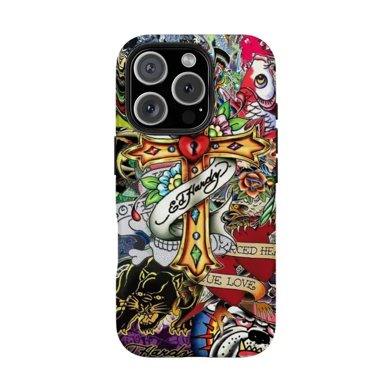 Pink Ed Hardy Skull Leopard Tattoo iPhone Case Aesthetic Y2k Trendy Tiger Ed Hardy Collage Phone Casefor iPhone 16/15/14/13/12/11/17 ProMax Plus