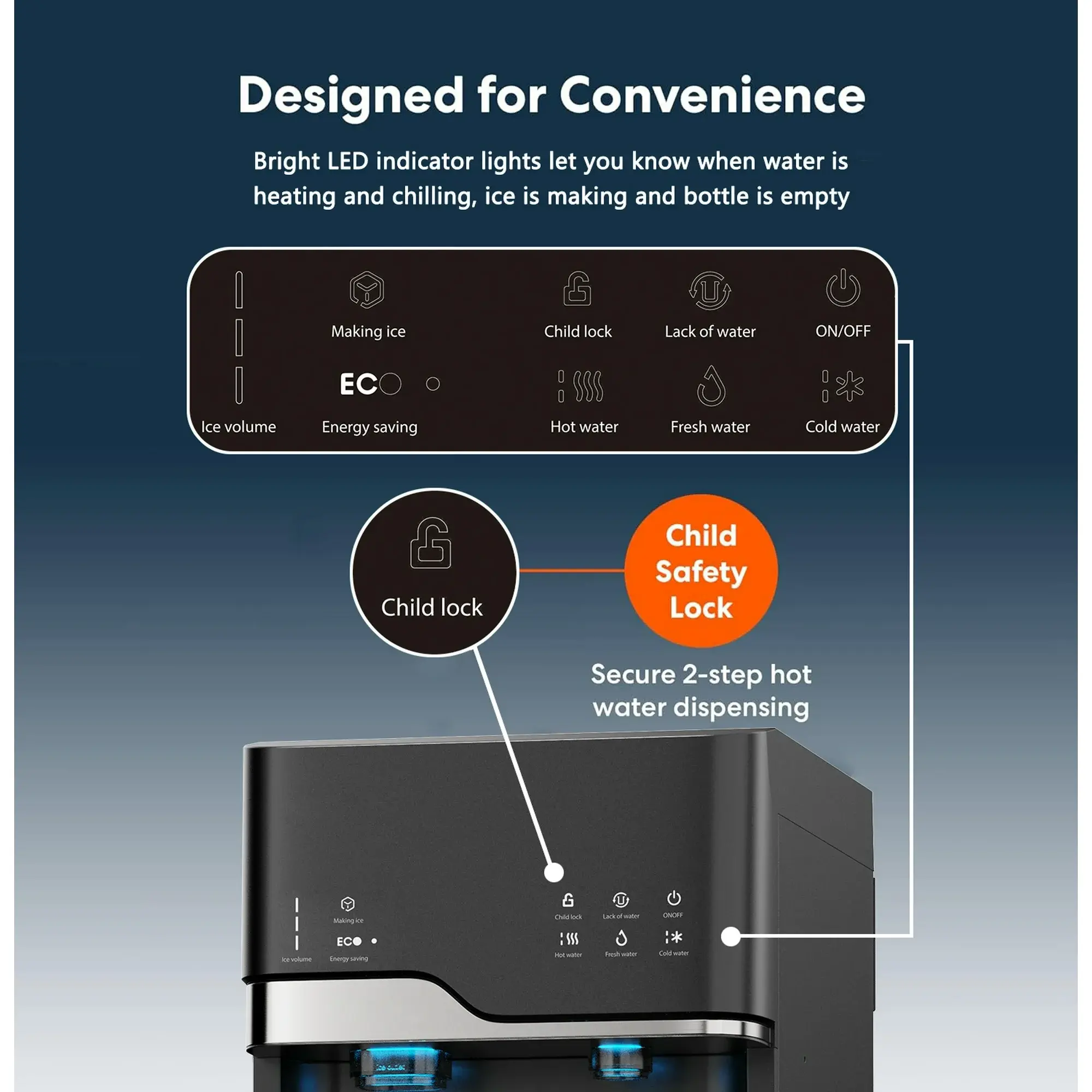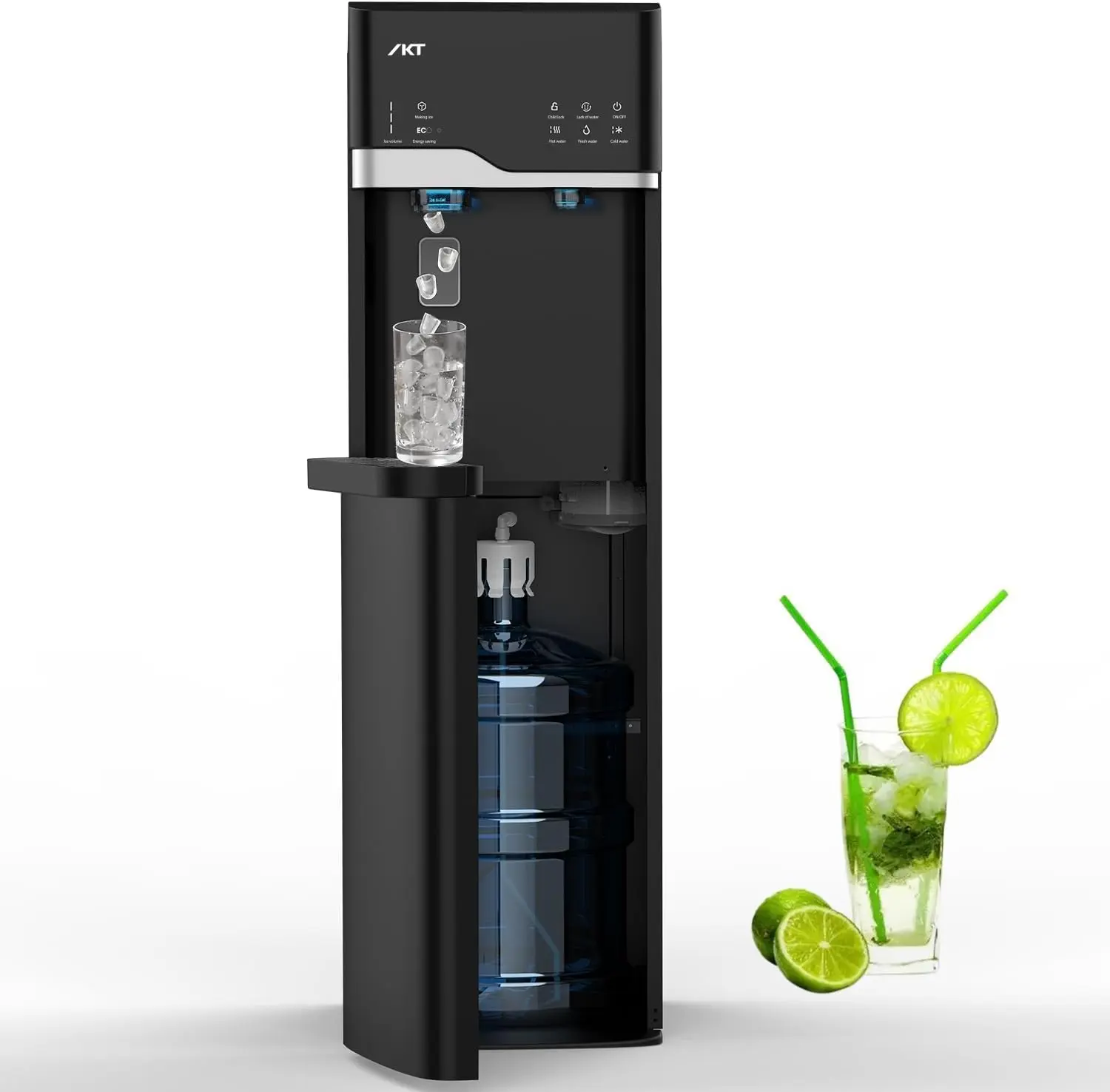 The IKT water dispenser with ice maker innovative bottom-load water cooler dispenser design, eliminates heavy lifting and flipping of water jugs required by top-load coolers This cooler features tri-temperature button that makes it easy to dispense cold water as low as 40 degrees, hot water up to 198 degrees and room-temperature water The hot water spout is equipped with a child safety lock, so the entire family can use it worry free An indicator light lets users know when hot , cold water and ice cubes is ready for use and when the bottle needs to be replaced Our cooler is compatible with 3-5 gallon capacity bottles This water cooler built-in ice maker ,it makes up 22 lbs of ice daily【Hot, Cold and Room Water】When you use our water cooler dispenser you can choose between crisp cold, room-temperature and piping hot output, making it ideal for cool refreshments or toasty beverages.Click the power button to turn on the cold water function .When the 2 blue lights stay on , it means the cold water is ready.