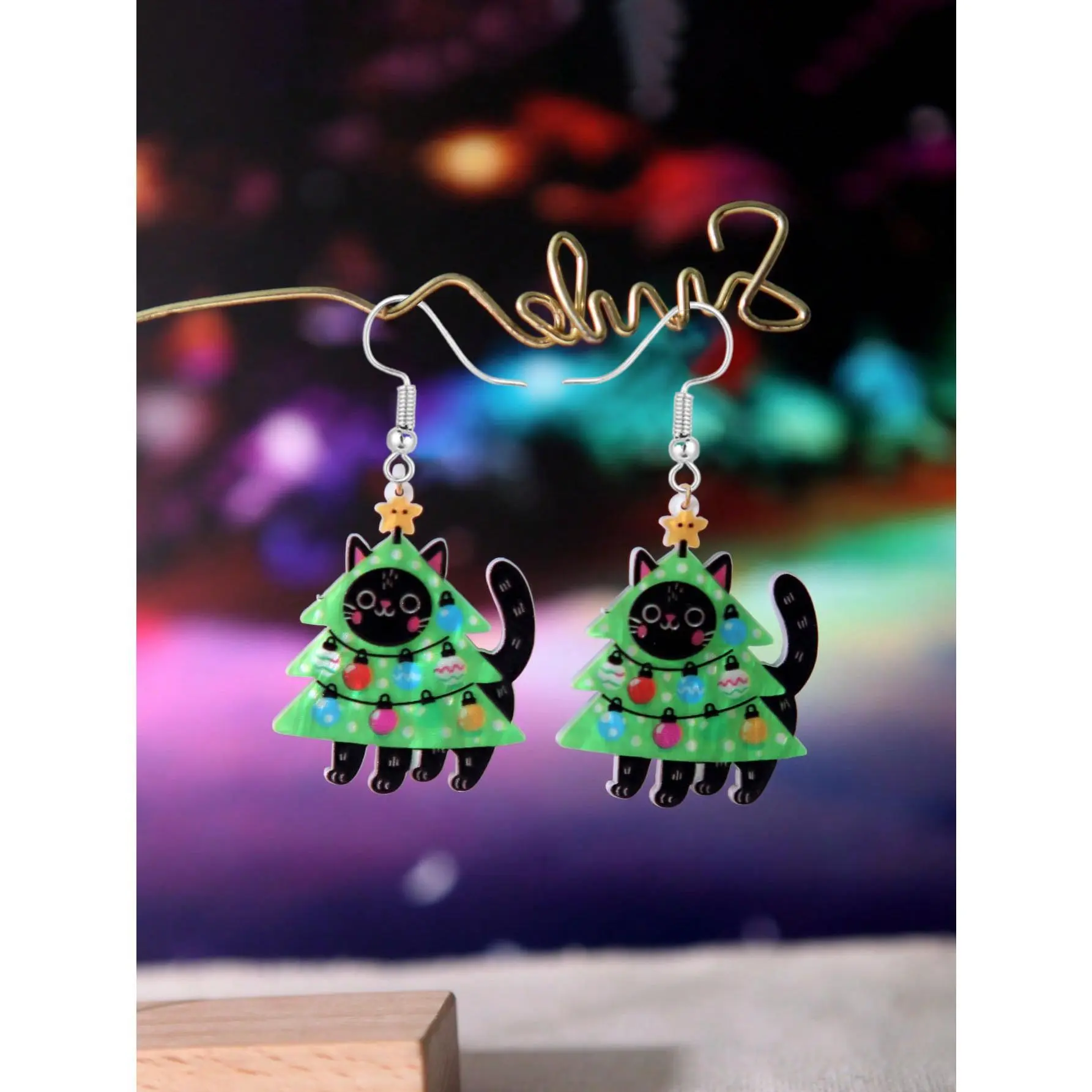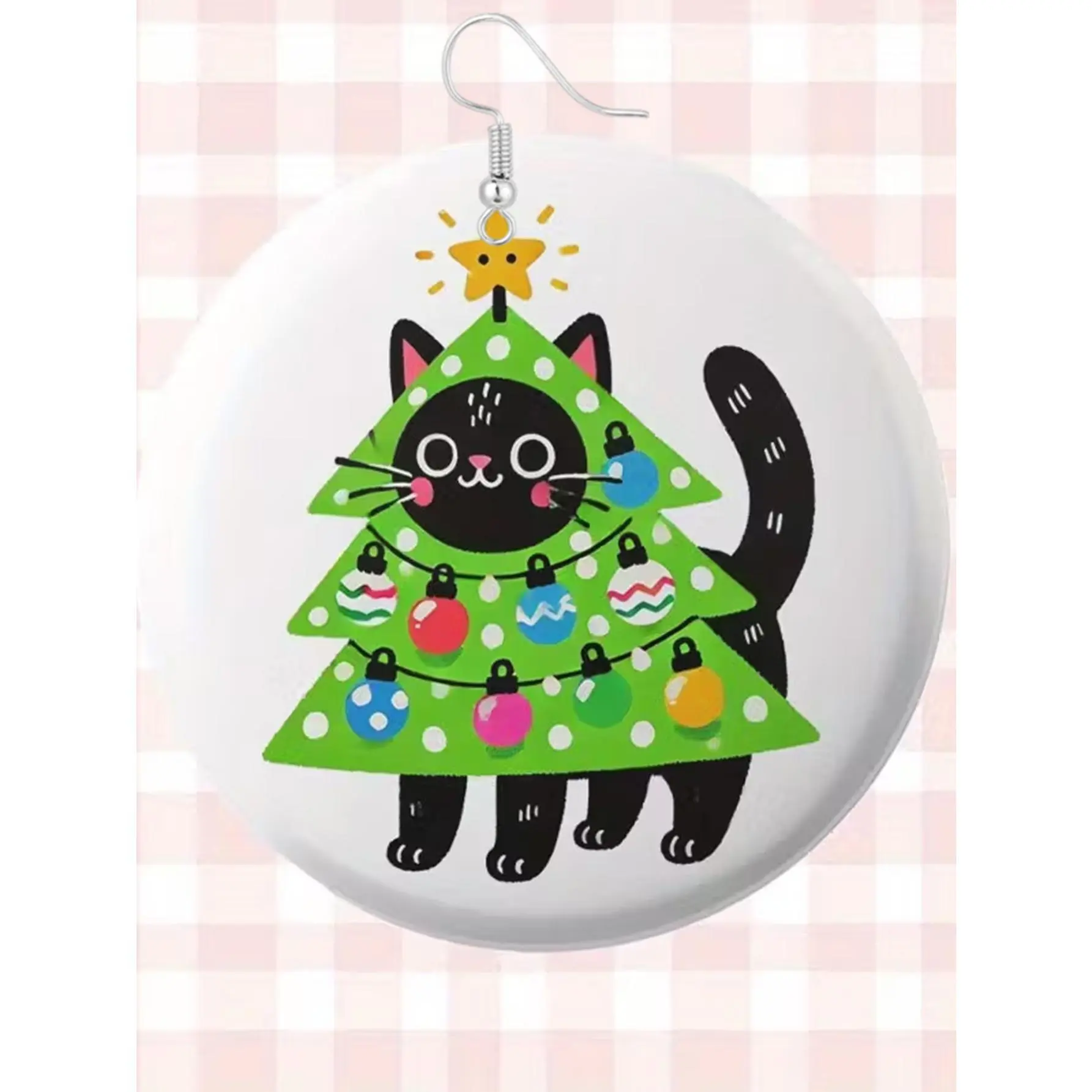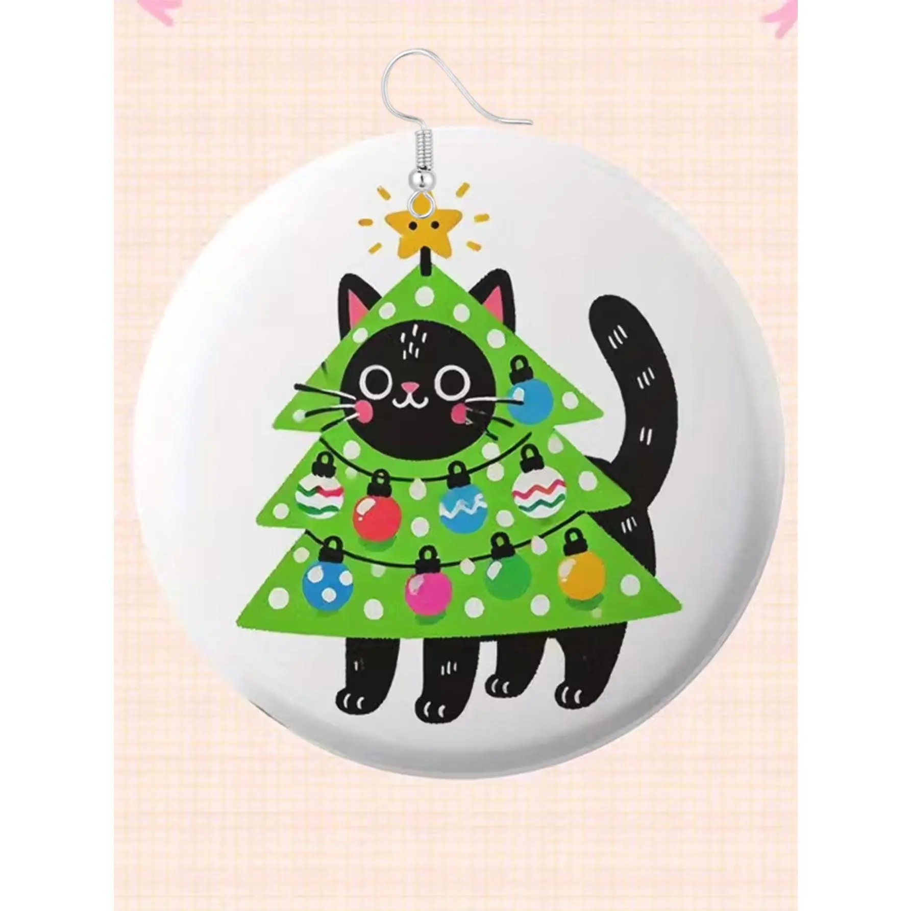 Black Cat Fun and Cute Christmas Earrings - Personalized Acrylic Earrings, Christmas Tree, Black Cat, Gingerbread Man Design Pen