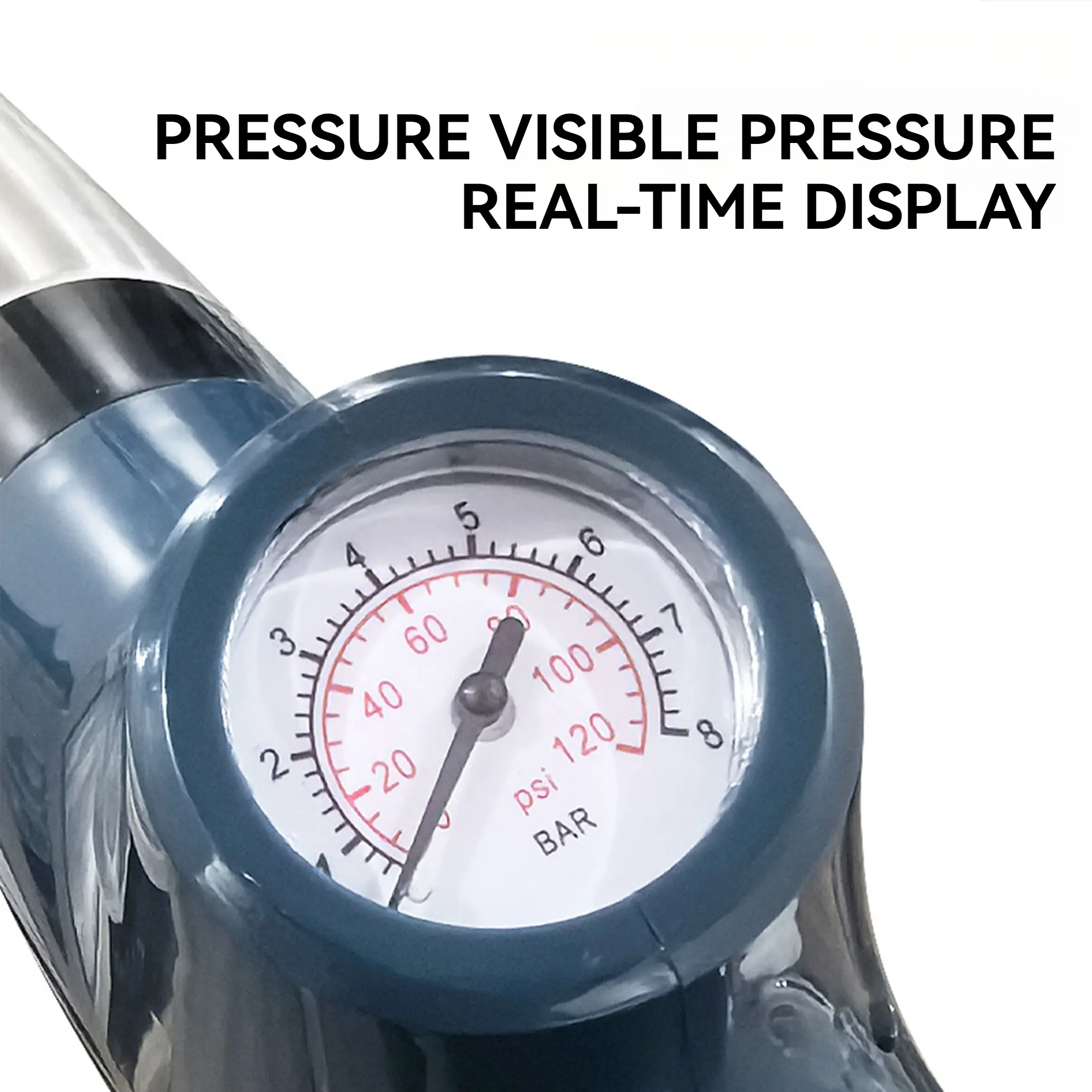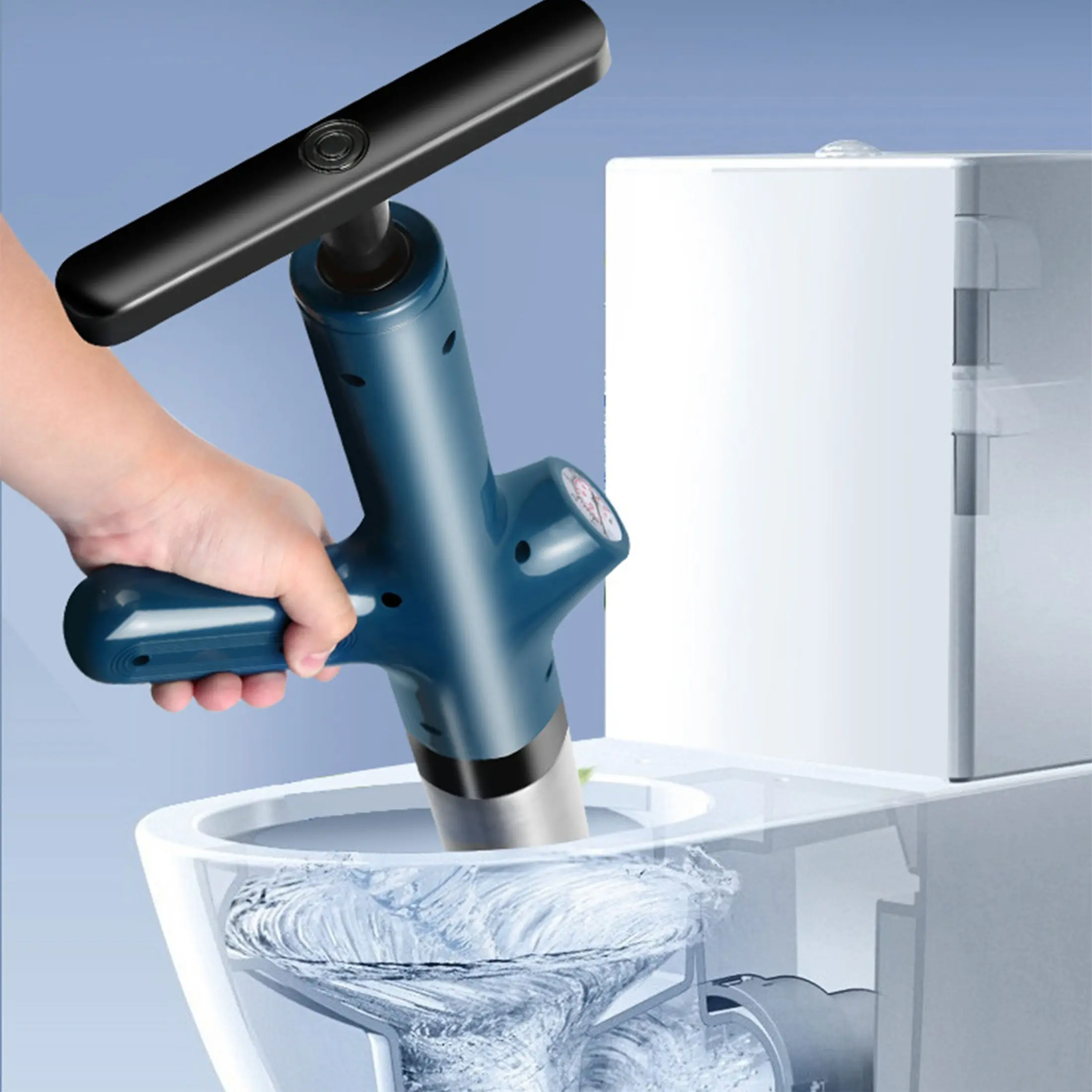 [REAL-TIME BAROMETER]: The toilet plunger features a real-time barometer for monitoring and adjusting pressure, ensuring precise control over pneumatic activities and preventing splashes or damage from excessive force. (Note: Barometer remains constant during inflation; ensure sealing ring is tight and positioned correctly.)