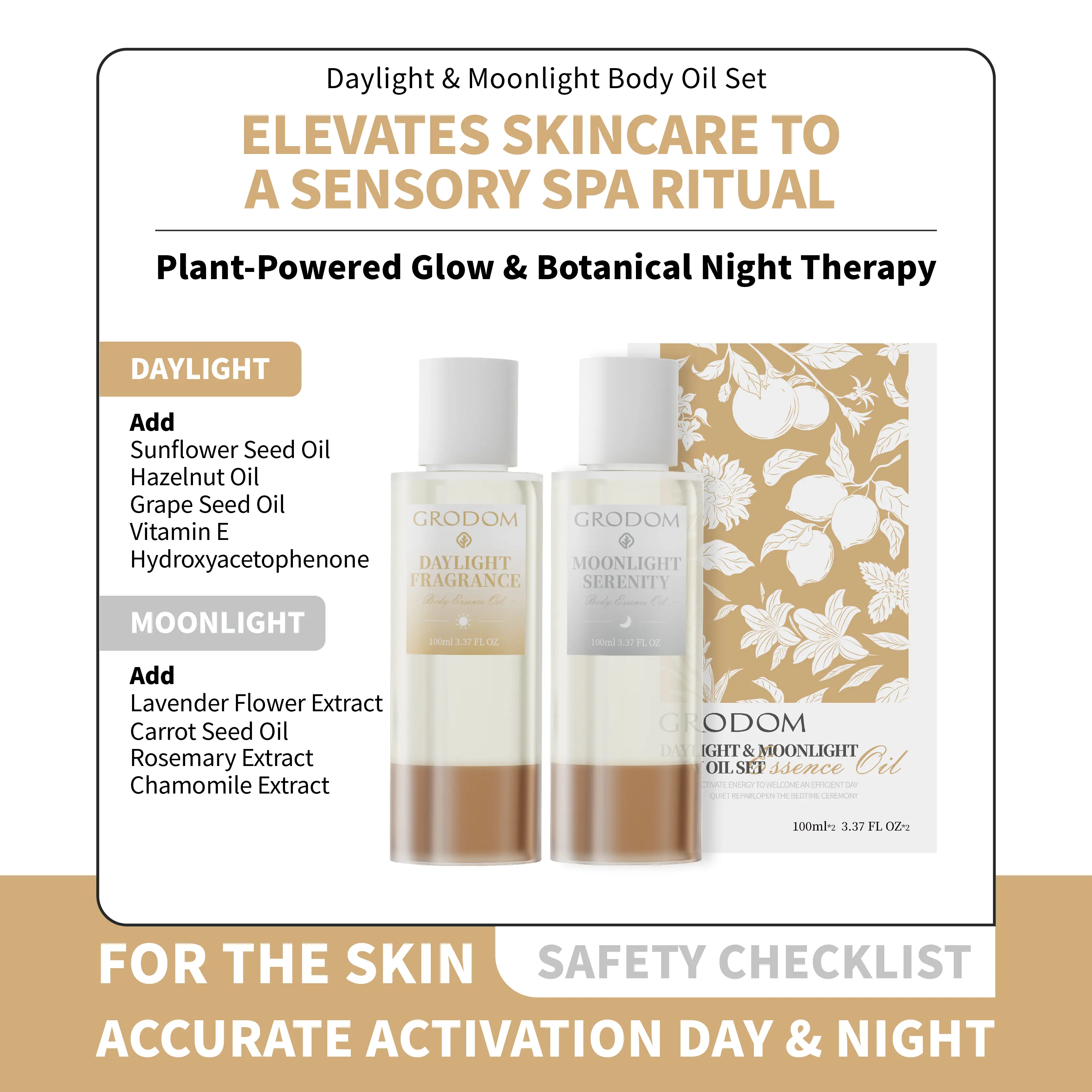 GRODOM Day & Night Body Essence Oil Set Plant-Based Moisturizing Serum for Hydrating Brightening Skin Citrus Daylight Lavender Night Repair Smooth Radiant Skin Care Daily Use 100ml