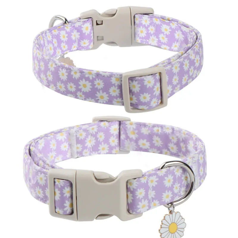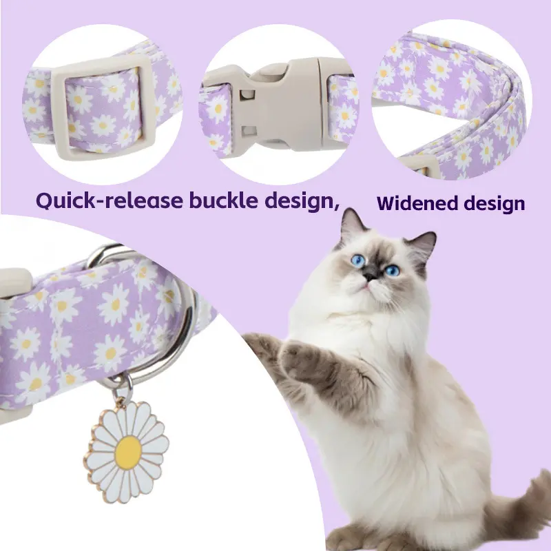 Cat & Dog Collar, Purple Daisy Print Adjustable Pet Collar with Quick Release Buckle, Soft Comfortable Durable No Smell Collar for Small Medium Dogs Cats, Cute Floral Pet Neck Accessory with Daisy Charm