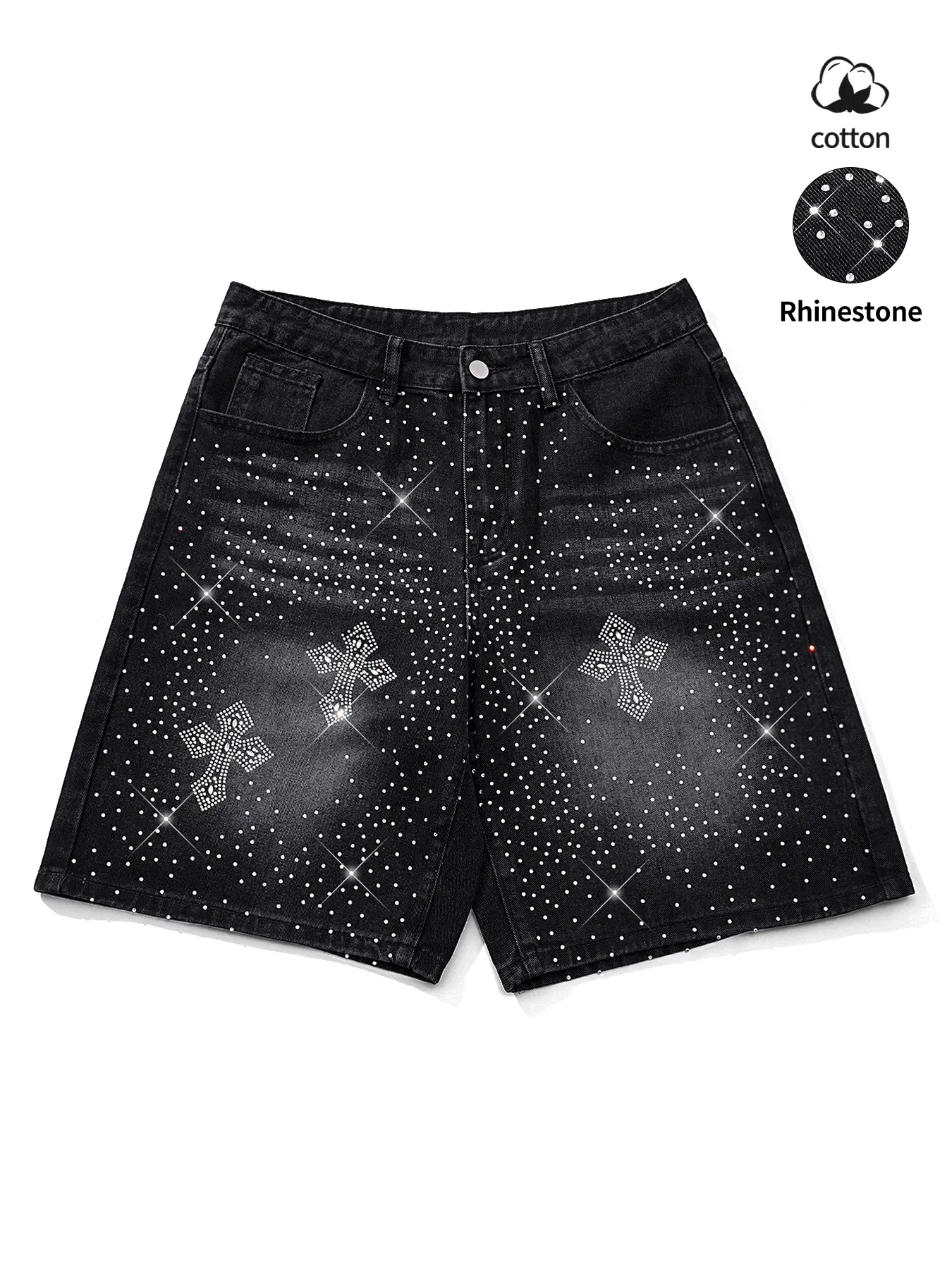 Summer unisex rhinestone casual denim shorts—mid-thigh denim shorts with a rhinestone design and an American street style, fashionable for everyday wear.