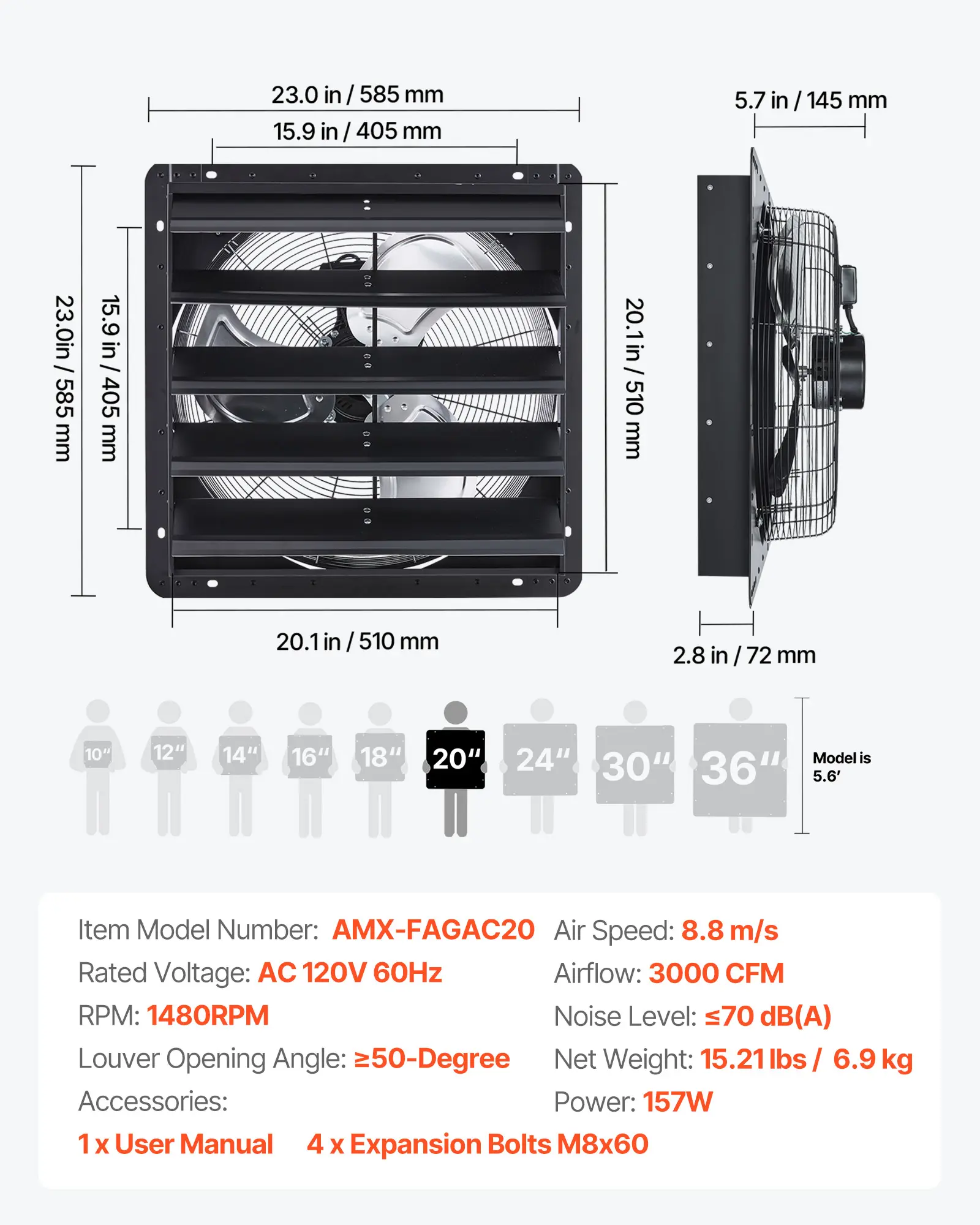 Rapid Venting: This shutter exhaust fan delivers 3000 CFM to quickly expel stale air, floating dirt, heat, and bad smells, keeping indoor air fresh. Also works as a high-airflow exhaust fan for sheds and workshops