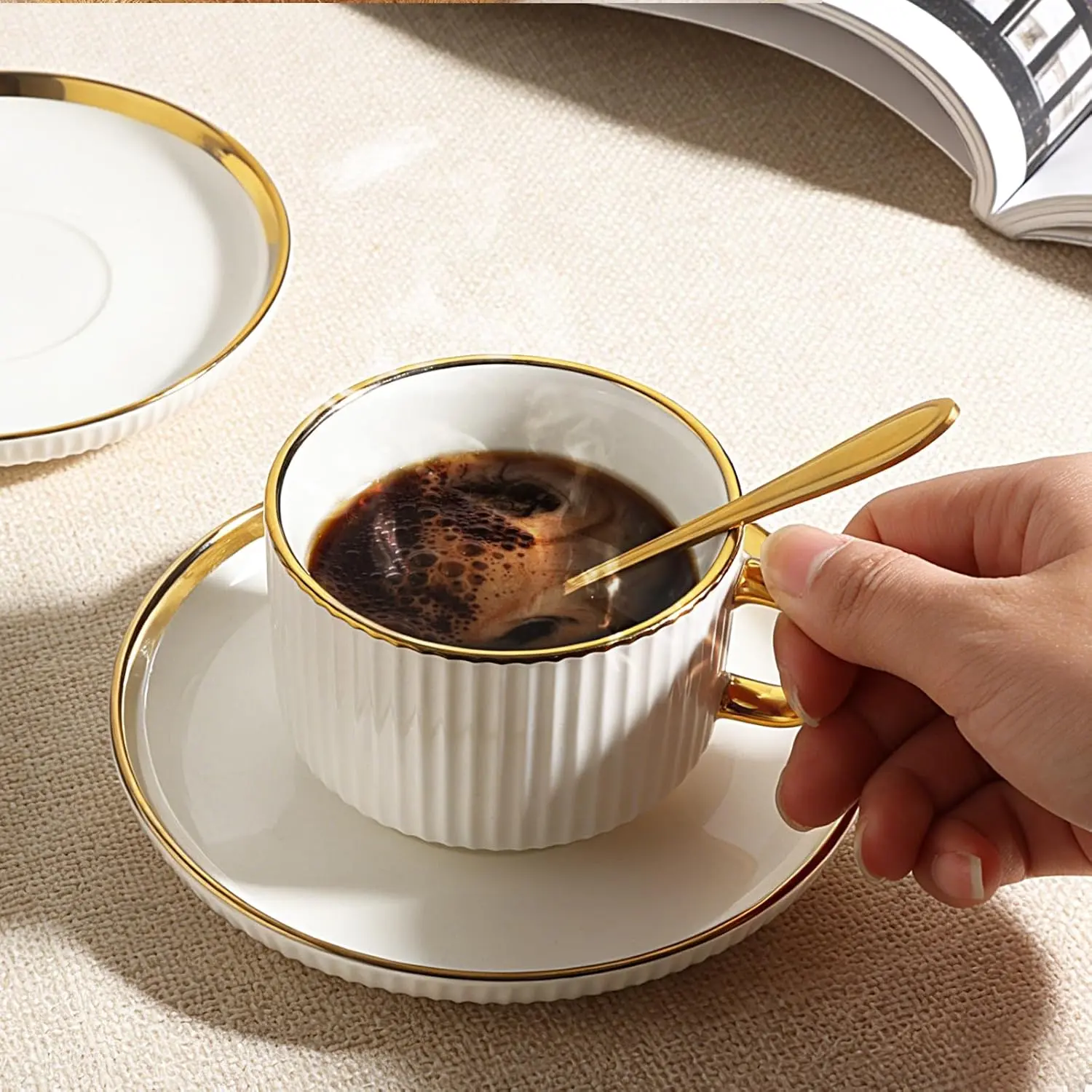 【Stylish Design】The coffee cup set features an elegant and noble gold-striped texture design. The classic gold-and-white color scheme lends the entire set a luxurious and refined feel, adding a stunning accent to your table. The tray incorporates a unique folding design that effectively prevents drips, keeping your tabletop dry and tidy.