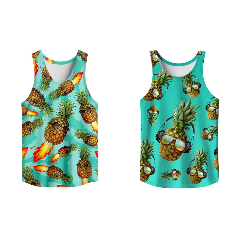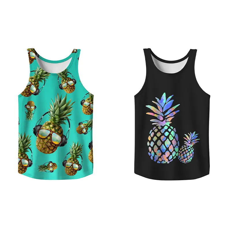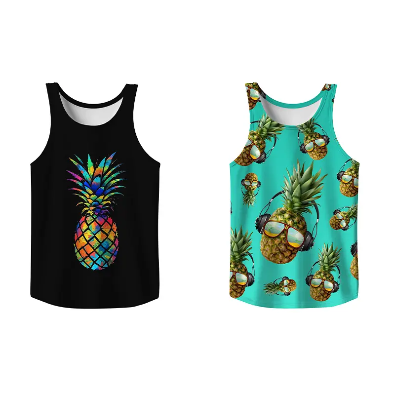 2 Pack Tropical Fruit Graffiti Tank Top, Summer Men Clothes Slim Fit Apparel, Menswear Gym Workout Comfy Casual Sleeveless for Vacation Outfit
