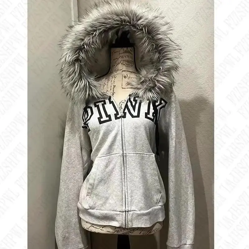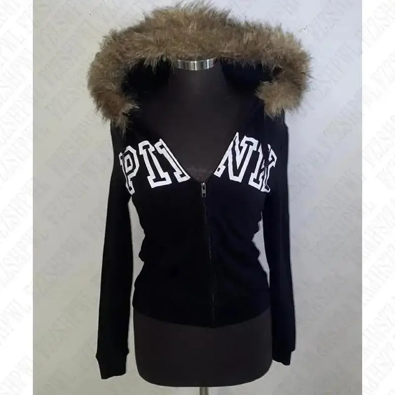 streetwear y2k zip Vintage Emo Fur Hoodie Jacket Women Gothic Hip Hop Fashion Graphic Punk Letter Print Zip Up Hoodies Aesthetic Harajuku Hoodies Clothes Streetwear EMO Girl