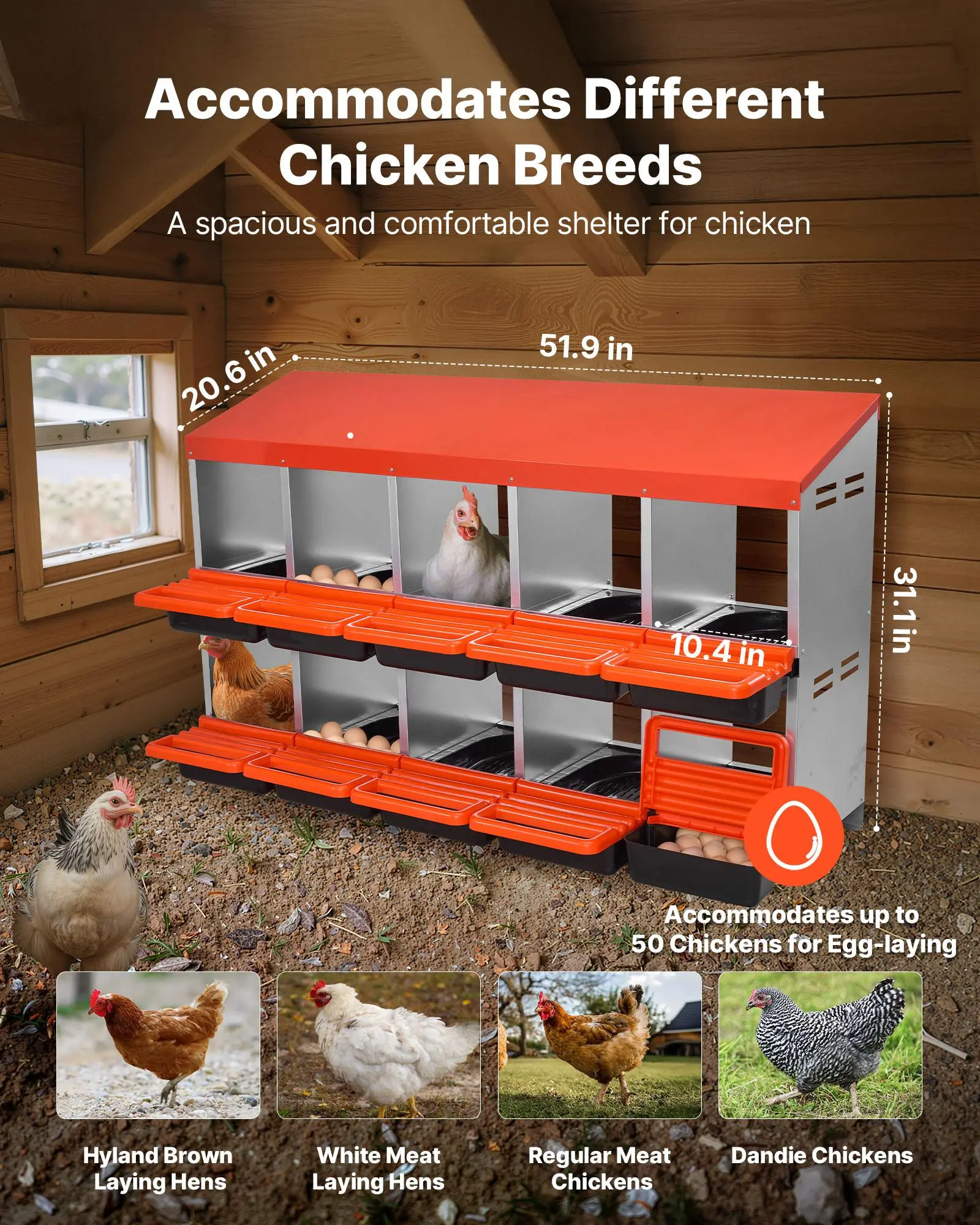Spacious Nesting Space: Our chicken nesting boxes feature an easy-to-clean 10-compartment single-layer design (30–45 in/762–1067mm), each 10.4 in (265 mm) wide, which fits various chicken breeds. One box holds up to 5 hens' eggs for efficient laying