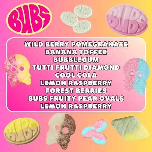 🍬 Swedish Candy Bubs Mix with 8 Flavors of Swedish candy foam mix from Bubs, featuring Banana Ovals, Wild Strawberry Pomegranate Ovals, Dizzy Skulls, Sour Skulls, Fruity Pear, and Sour Foam Rombs Tutti Frutti. Blueberry Raspberry Minis A sweet and sour bulk candy variety.