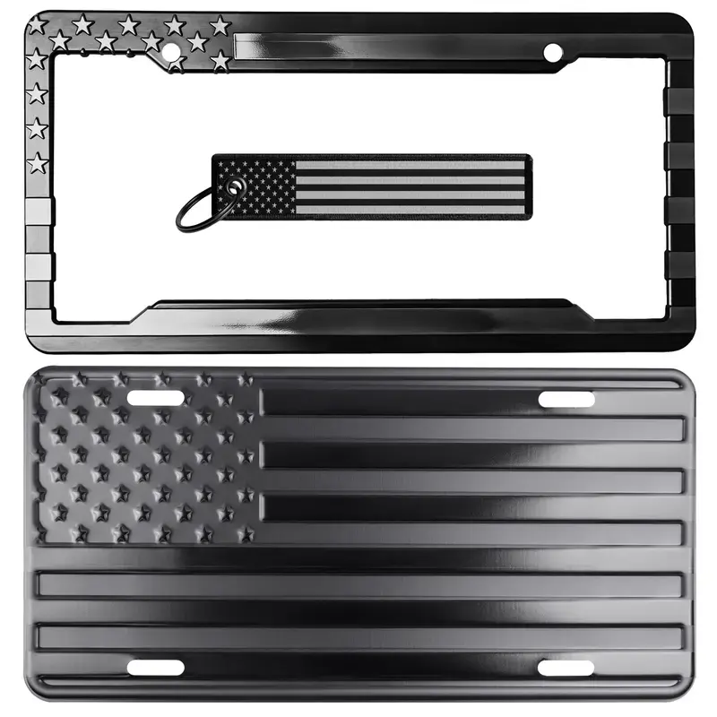 American Flag License Plate, Frame, and Key Tag Combo Black-on-Matte Black