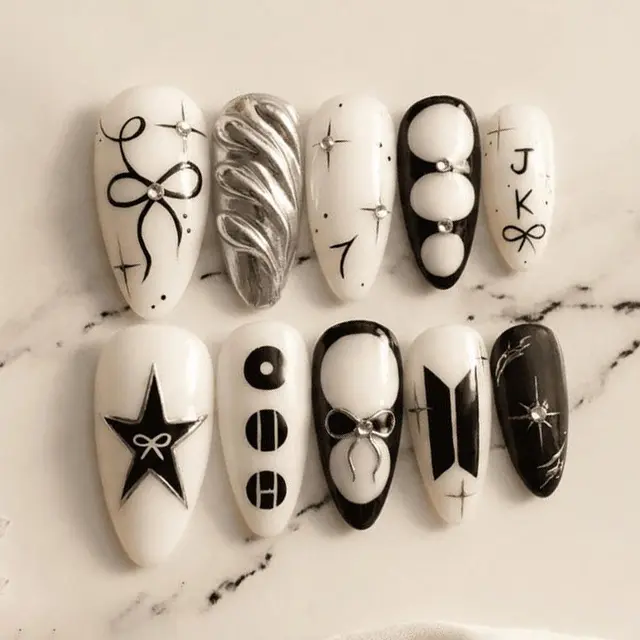 Sarahmarket Black White Minimal Star Press-On Nails, Hand-Painted Symbols & Chrome Texture, Yin Yang & Ribbon Details, Modern Kpop Inspired Style, Clean Aesthetic Nail Art, Everyday Cool Look, Custom Handmade Set