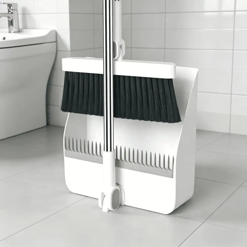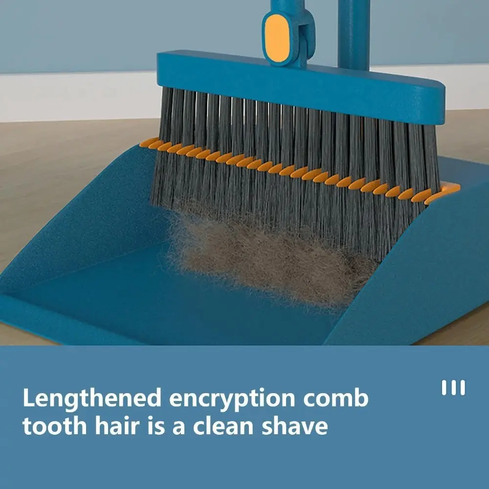 The dustpan features a comb tooth design to help remove hair and dust from the broom.